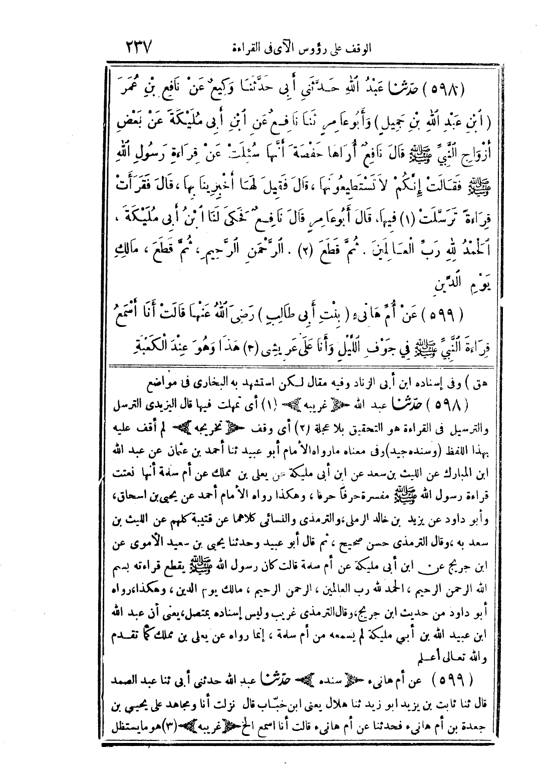 (598) حدّثنا عبد الله حدَّثنى أبى حدَّنا وكيعٌ عن نافه بن عمر (ابن عبد الله بن جميلٍ) وأبو عامر ثنا نافعٌ عن ابن أبى مليكة عن بعض أزواج النبيٍّ صلى الله عليه وسلم قال نافعٌ أراها حفصة أنَّها سئلت عن قراءة رسول الله صلى الله عليه وسلم فقالت إنكم لا تسطيعونها، قال فقيل لها أخبرينا بها، قال فقرأت قراءة ترسَّلت (1) فيها، قال أبو عامرٍ قال نافعٌ فحكى لنا ابن أبى مليكة، الحمد لله رب العالمين. ثمَّ قطه (2). الرَّحمن الرَّحيم، ثمَّ قطع، مالك يوم الدِّين.