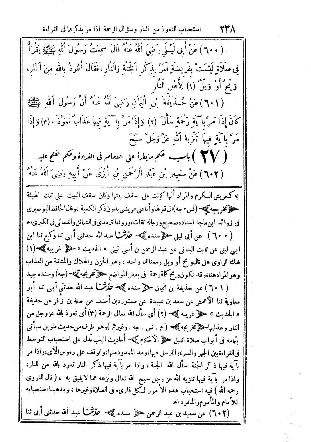 (601) عن حذيفة بن اليمان رضي الله عنه أنَّ رسول الله صلى الله عليه وسلم كان إذا مرَّ بآية رحمةٍ سأل (2) وإذا مرَّ بآيةٍ فيها عذابٌ تعوَّذ، (3) وإذا مرَّ بآيةٍ فيها تنزيه الله عزِّ وجلَّ سبّح