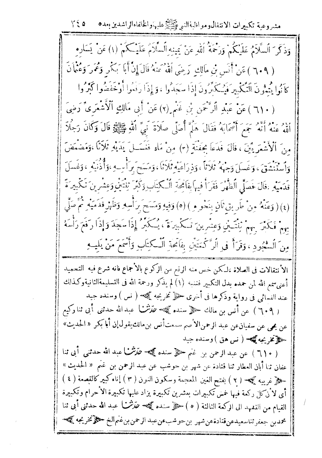 الانتقالات في الصلاة لكن خصمنه الرفع من الركوع بالإجماع فإنه شرع فيه التحميد أعني سمع الله لمن حمده بدل التكبير فتنبه (1) لم يذكر ورحمة الله في التسليمة الثانية وكذلك عند النسائي في رواية وذكرها في أخرى (تخريجه) (نس) وسنده جيد 609 عن أنس بن مالك (سنده) حدثنا يع عن يحيى عن سفيان عن عبد الرحمن الأصم سمعت أنس بن مالك يقول إن أبا بكر " الحديث " (تخريجه) (نس هق) وسنده جيد 610 عن عبد الرحمن بن غنم (سنده) حدثنا عبد الله حدثني أبي ثنا عفان ثنا أبان العطار ثنا قتادة عن شهر بن حوشب عن عبد الرحمن بن غنم "الحديث " (غريبه) (2) بفتح الغين المعجمة وسكون النون (3) إناء كبير كالقصعة (4) أي لأن كل ركعة فيها خمس تكبيرات بعشرين تكبيرة يزاد عليها تكبيرة الإحرام وتكبيرة القيام من التشهد إلى الركعة الثالثة (5) (سنده) حدثنا عبد الله حدثني أبي ثنا محمد بن جعفر ثنا سعيد عن قتادة عن شهر بن حوشب عن عبد الرحمن بن غنم الخ (تخريجه)