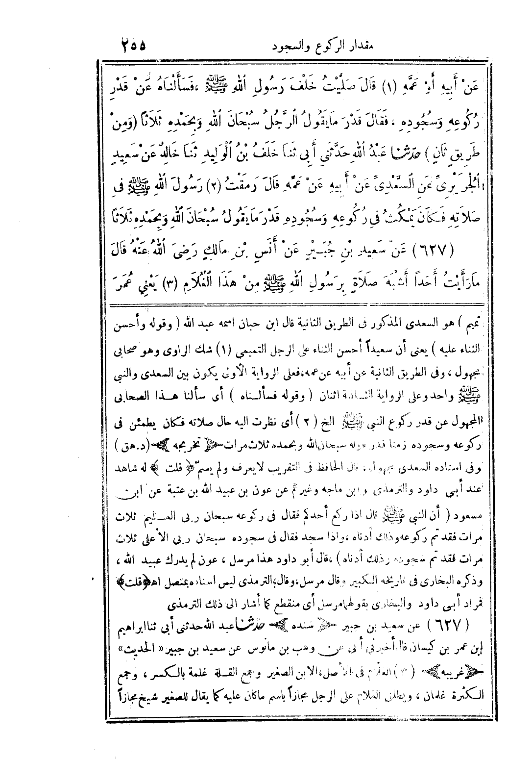 تميم) هو السعدي المذكور اسمه عبد الله (وقوله وأحسن الثناء عليه) يعني أن سعيداً أحسن الثناء على الرجل التميمي (1) شك الراوي وهو صحابي مجهول وفي الطريق الثانية عن أبيه عن عمه فعلى الرواية الأولى يكون بين السعدي والنبي صلى الله عليه وسلم واحد وعلى الرواية الثانية اثنان (وقوله فسألناه) أي سألنا هذا الصحابي المجهول عن قدر ركوع النبي صلى الله عليه وسلم الخ (2) أي نظرت إليه حال صلاته فكان يطمئن في ركوعه وسجوده زمناً قدر قوله سبحان الله وبحمده ثلاث مرات (تخريجه) (د. هق) وفي إسناده السعدي مجهول قال الحافظ في التقريب لا يعرف ولم يسم (قلت) له شاهد عند أبي داود والترمذي وابن ماجه وغيرهم عن عون بن عبيد الله بن عتبة عن ابن مسعود (أن النبي صلى الله عليه وسلم قال إذا ركع أحدكم فقال في ركوعه سبحان ربي العظيم ثلاث مرات فقد تم ركوعه وذلك أدناه وإذا سجد فقال في سجوده سبحان ربي الأعلى ثلاث مرات فقد تم سجوده وذلك أدناه) قال أبو داود هذا مرسل عون لم يدرك عبيد الله وذكره البخاري في تاريخه الكبير وقال مرسل وقال الترمذي ليس إسناده بمتصل اهـ (قلت) فمراد أبي داود والبخاري بقولهما مرسل أي منقطع كما أشار إلى ذلك الترمذي 627 عن سعيد بن جبير (سنده) حدثنا عبد الله حدثني أبي ثنا إبراهيم ابن عمر بن كيسان قال أخبرني أبي عن وهب بن مانوس عن سعيد بن جبير " الحديث " (غريبه) (3) الغلام في الأصل الابن الصغير وجمع القلة غلمة بالكسر وجمع الكثرة غلمان ويطلق الغلام على الرجل مجازاً باسم ما كان عليه كما يقال للصغير شيخ مجازاً