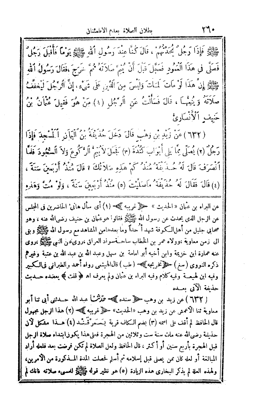 عن البراء بن عثمان " الحديث " (غريبه) (1) أي سأل هانئ الحاضرين في المجلس عن الرجل الذي يحدث عن رسول الله صلى الله عليه وسلم فقالوا هو عثمان بن حنيف رضي الله عنه وهو صحابي جليل من أهل الكوفة شهد أحداً وما بعدها من المشاهد مع رسول الله صلى الله عليه وسلم وبقى إلى زمن معاوية وولاه عمر بن الخطاب ساحة سواد العراق روى عن النبي صلى الله عليه وسلم روى عنه عمارة ابن خزيمة وابن أخيه أبو أمامة بن سهل وعبد الله بن عبد الله بن عتبة وغيرهم ذره النووي (سغ) (تخريجه) (طب) قال الهيثمي رواه أحمد والطبراني في الكبير وفيه ابن لهيعة وفيه كلام وفيه البراء بن عثمان ول حديث حذيفة الآتي بعده 632 عن زيد بن وهب (سنده) حدثنا عبد الله حدثني أبي ثنا أبو معاوية ثنا العشم عن زيد (3) بضم الكاف قرية بسمر قند (4) هذا مشكل لأن حذيفة رضي الله عنه مات سنة وثلاثين من الهجرة فعلى هذا يكون ابتداء صلاة الرجل قبل الهجرة بأربع سنين أو أكثر قال الحافظ ولعل الصلاة لم تكن فرضت بعد فلعله أراد المبالغة أو لعله كان ممن يصلي قبل إسلامه ثم أسلم فحصلت المدة المذكورة من الأمرين ولهذا العلة لم يذكر البخاري هذه الزيادة (5) هو نظير صلى الله عليه وسلم للمسيء صلاته فإنك لم