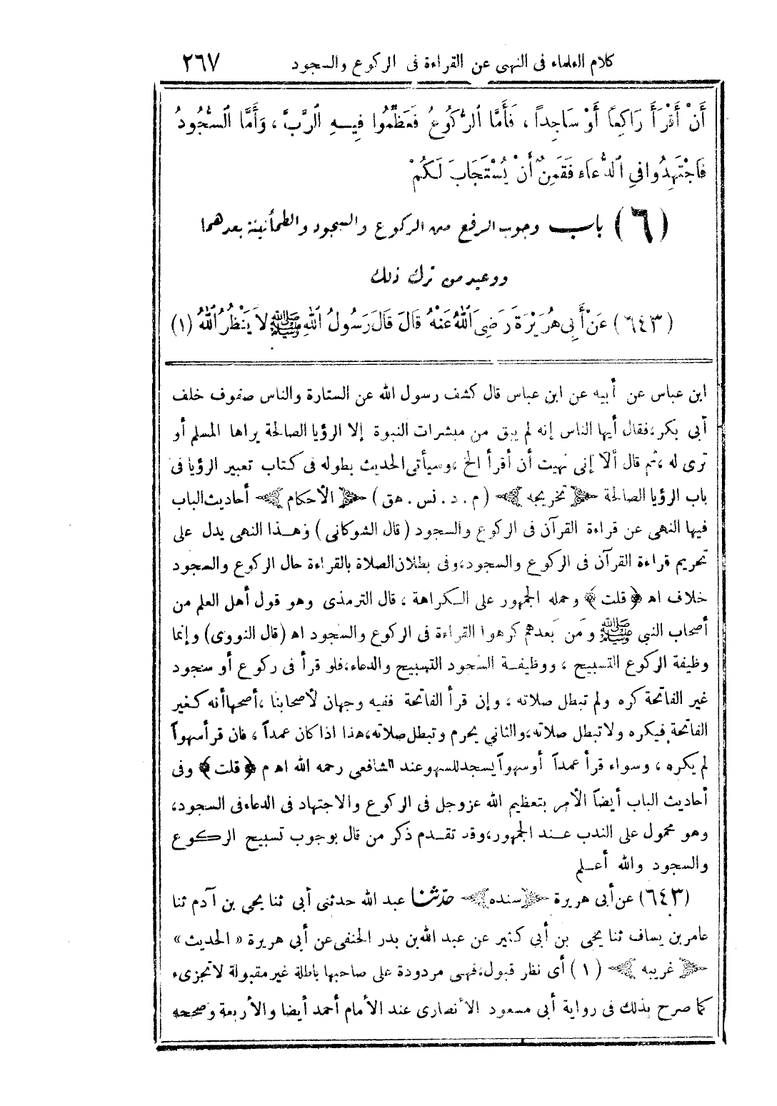 ابن عباس عن أبيه عن ابن عباس قال كشف رسول الله عن الستارة والناس صفوف خلف أبي بكر فقال أيها الناس إنه لم يبق من مبشرات النبوة إلا الرؤيا صالحة يراها المسلم أو ترى له ثم قال ألا إني نهيت أن أقرأ الخ وسيأتي الحديث بطوله في كتاب تعبير الرؤيا في باب الرؤيا الصالحة (تخريجه) (م. د. نس. هق) (الأحكام) أحاديث الباب فيها النهي عن قراءة القرآن في الركوع والسجود (قال الشوكاني) وهذا النهي يدل على تحريم قراءة القرآن في الركوع والسجود وفي بطلان الصلاة بالقراءة حال الركوع والسجود خلاف اهـ (قلت) وحمله الجمهور على الكراهة قال الترمذي وهو قول أهل من أصحاب النبي صلى الله عليه وسلم ومن بعدهم كرهوا القراءة في الركوع والسجود اهـ (قال النووي) وإنما وظيفة الركوع التسبيح ووظيفة السجود التسبيح والدعاء فلو قرأ في ركوع أو سجود غير الفاتحة كره ولم تبطل صلاته وإن قرأ الفاتحة ففيه وجهان لأصحابنا أصحها أنه كغير الفاتحة فيكره ولا تبطل صلاته والثاني يحرم وتبطل صلاته هذا إذا كان عمداً فإن قرأ سهواً لمي كره وسواء قرأ عمداً أو سهواً يسجد للسهو عند الشافعي رحمه الله اهـ م (قلت) وفي أحاديث الباب أيضاً الأمر بتعظيم الله عز وجل في الركوع والاجتهاد في الدعاء في السجود وهو محمول على الندب عند الجمهور وقد تقدم ذكر من قال بوجوب تسبيح الركوع والسجود والله أعلم 643 عن أبي هريرة (سنده) حدثنا عبد الله حدثني أبي ثنا يحيى بن آدم ثنا عامر بن يساف يحيى بن أبي كثير عن عبد اله بن بدر الحنفي عن أبي هريرة " الحديث " (غريبه) (1) أي نظر قبول فهي مردودة على صاحبها باطلة غير مقبولة لا تجزئ كما صرح بذلك في رواية أبي مسعود الأنصاري عند الإمام أحمد أيضاً والأربعة وصححه