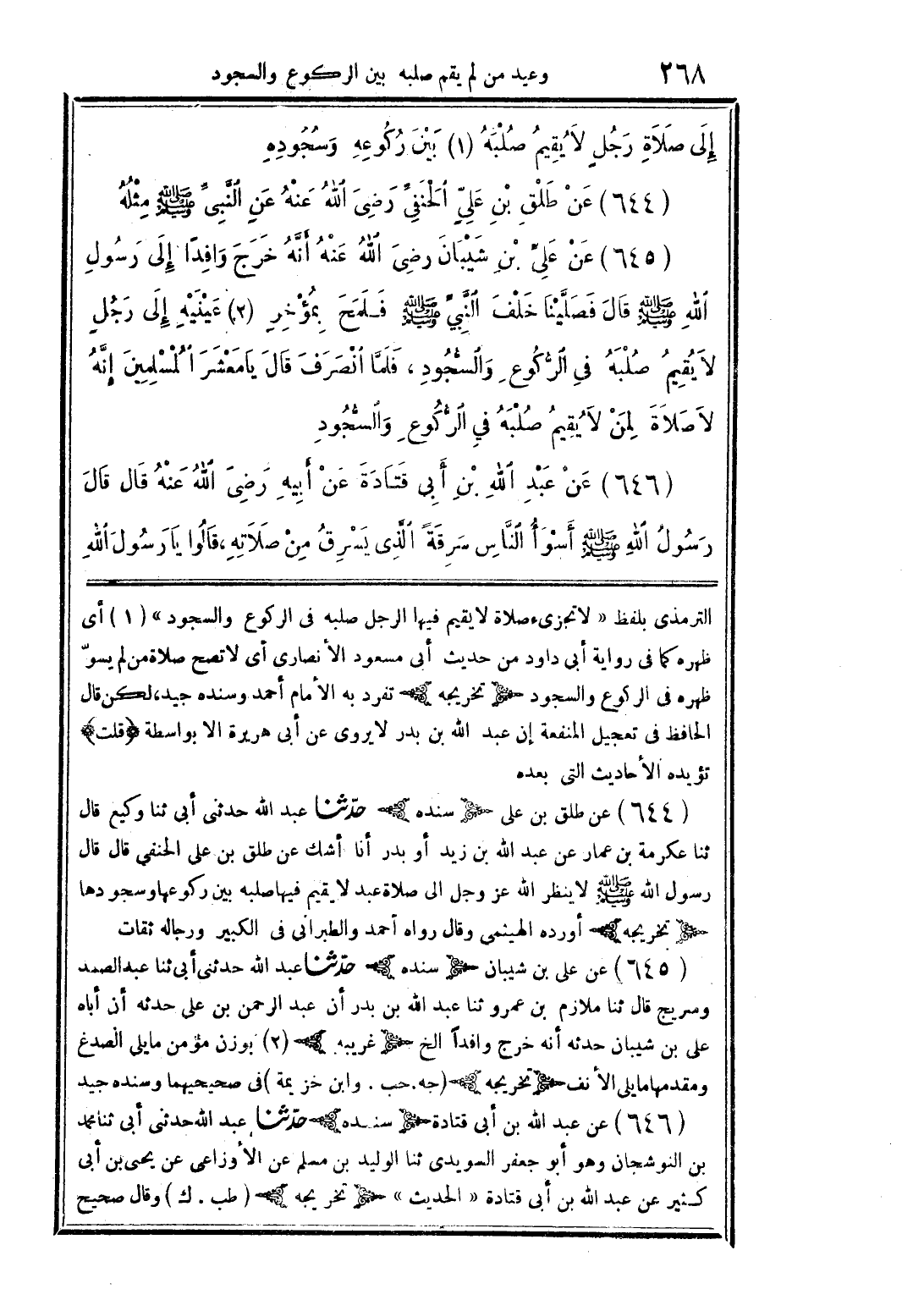 (645) عن علىِّ بن شيبان رضي الله عنه أنَّه خرج وافدًا إلى رسول الله صلى الله عليه وسلم قال فصلَّينا خلف النَّبىِّ صلى الله عليه وسلم فلمح بمؤخر (2) عينيه إلى رجلٍ لا يقيم صلبه فى الرُّكوع والسُّجود، فلمَّا انصرف قال يا معشر المسلمين إنَّه لا صلاة لمن لا يُقيم صلبه فى الرُّكوع والسُّجود