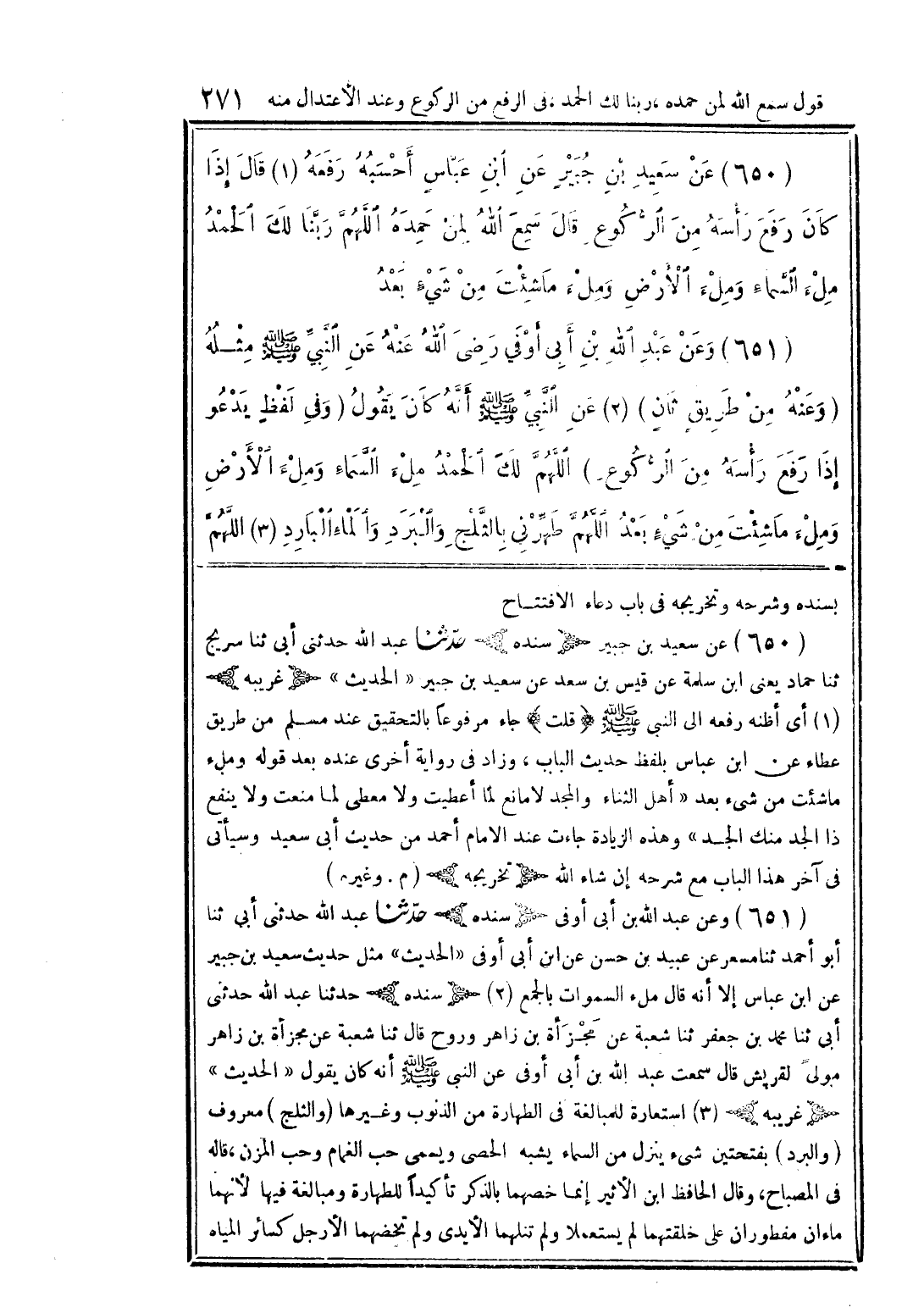 (651) وعن عبد الله بن أبى أوفي رضي الله عنه عن النبيِّ صلى الله عليه وسلم مثله (وعنه من طريق ثانٍ) (2) عن النبيِّ صلى الله عليه وسلم أنَّه كان يقول (وفى لفظٍ يدعو إذا رفع رأسه من الرُّكوع) اللهمَّ لك الحمد ملء السَّماء وملء الأرض وملء ما شئت من شيءٍ بعد اللَّهم طهرِّنى بالثَّلج والبرد والماء البارد (3) اللَّهمَّ