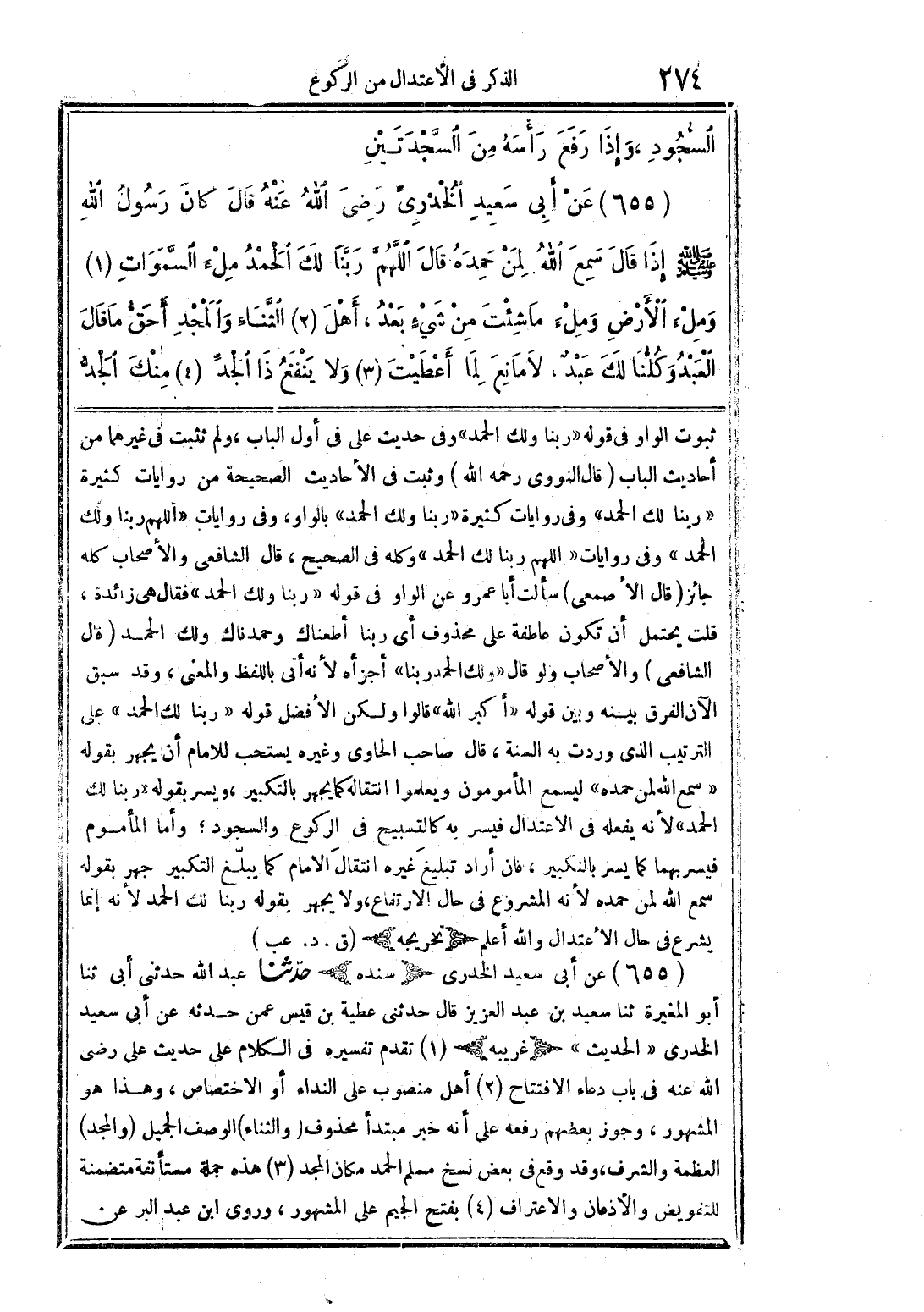 ثبوت الواو في قوله "ربنا ولك الحمد " وفي حديث علي أول الباب ولم تثبت في غيرهما من أحاديث الباب (قال النووي رحمه الله) وثبت في الأحاديث الصحيحة من روايات كثيرة " ربنا لك الحمد " وفي روايات كثيرة " ربنا ولك الحمد " بالواو وفي روايات " اللهم ربنا ولك الحمد " وفي روايات " اللهم ربنا لك الحمد " وكله في الصحيح قال الشافعي والأصحاب كله جائز (قال الأصمعي) سألت أبا عمرو عن الواو في قوله " ربنا ولك الحمد " فقال هي زائدة قلت يحتمل أن تكون عاطفة على محذوف أي ربنا أطعناك وحمدناك ولك الحمد (قال الشافعي) والأصحاب ولو قال " ولك الحمد ربنا " أجزأه لأنه أتى باللفظ والمعنى وقد سبق الآن الفرق بينه وبين قوله " أكبر الله " قالوا ولكن الأفضل قوله " ربنا لك الحمد " على الترتيب الذي وردت به السنة قال صاحب الحاوي وغيره يستحب للإمام أن يجهر بقوله " سمع الله حمده " ليسمع المأمومون ويعلموا انتقاله كما يجهر بالتكبير ويسر بقوله " ربنا لك الحمد " لأنه يفعله في الاعتدال فيسر به كالتسبيح في الركوع والسجود وأما المأموم فيسر بهما كما يسر بالتكبير فإن أراد تبليغ غيره انتقال الإمام كما يبلغ التكبير جهر بقوله سمع الله لمن حمده لأنه المشروع في حال الارتفاع ولا يجهر بقوله ربنا لك الحمد لأنه إنما يشرع في حال الاعتدال والله أعلم (تخريجه) (ق. د. عب) 655 عن أبي سعيد الخدري (سنده) حدثنا عبد الله حدثني أبي ثنا أبو المغيرة ثنا سعيد بن عبد العزيز قال حدثني عطية بن قيس عمن حدثه عن أبي سعيد الخدري " الحديث " (غريبه) (1) تقدم تفسيره في الكلام على حديث على رضي الله عنه في باب دعاء الافتتاح (2) أهل منصوب على النداء أو الاختصاص وهذا هو المشهور وجوز بعضهم رفعه على أنه خبر مبتدأ محذوف (والثناء) الوصف الجميل (والمجد) العظمة والشرف وقد وقع في بعض نسخ مسلم الحمد مكان المجد (3) هذه جملة مستأنفة متضمنة للتفويض والإذعان والاعتراف (4) بفتح الجيم على المشهور وروى ابن عبد البر عن