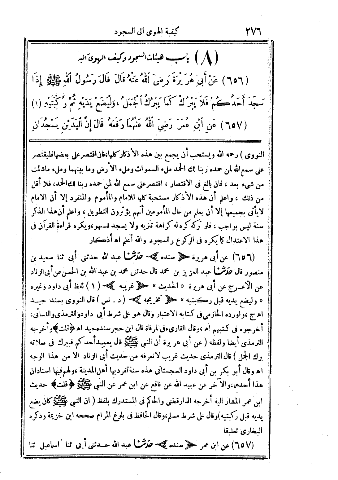 النووي) رحمه الله ويستحب أن يجمع بين هذه الأذكار كلها فإن اقتصر على بعضها فليقتصر على سمع الله لمن حمده ربنا لك الحمد ملء السموات والأرض وما بينهما وملء ما شئت من شيء بعد فإن بالغ في الاقتصار اقتصر على سمع الله لمن حمده فلا أقل من ذلك واعلم أن هذه الأذكار مستحبة كلها للإمام والمأموم والمنفرد إلا أن الإمام لا يأتي بجميعها إلا أن يعلم من حال المأمومين أنهم يؤثرون التطويل واعلم أن هذا الذكر سنة ليس بواجب فلو تركه كراهة تنزيه ولا يسجد للسهو ويكره قراءة القرآن في هذا الاعتدال كما يكره في الركوع والله أعلم اهـ أذكار 656 عن أبي هريرة (سنده) حدثنا عبد الله حدثني أبي ثنا سعيد بن منصور قال حدثنا عبد العزيز بن محمد قال حدثني محمد بن عبد الله بن الحسن عن أبي الزناد عن الأعرج عن أبي هريرة " الحديث " (غريبه) (1) لفظ أبي داود وغيره " وليضع يديه قبل ركبتيه " (تخريجه) (د. نس) قال النووي بسند جيد اهـ ج وأورده الحازمي في كتابه الاعتبار وقال هو على شرط أبي داود والترمذي والنسائي أخرجوه في كتبهم اهـ وقال القارئ في المرقاة قال ابن حجر سنده جيد اهـ (قلت) وأخرجه الترمذي أيضاً ولفظه (عن أبي هريرة أن النبي صلى الله عليه وسلم قال يعمد أحدكم فيبرك في صلاته برك الجمل) قال الترمذي حديث غريب لا نعرفه من حديث أبي الزناد إلا من هذا الوجه اهـ وقال أبو بكر بن أبي داود السجستاني هذه سنة تقربها أهل المدينة ولهم فيها إسنادان هذا أحدهما والآخر عن عبيد الله عن نافع عن ابن عمر عن النبي صلى الله عليه وسلم (قلت) حديث ابن عمر المشار إليه أخرجه الدارقطني والحاكم في المستدرك بلفظ (إن النبي صلى الله عليه وسلم كان يضع يديه قبل ركبتيه) وقال على شرط مسلم وقال الحافظ في بلوغ المرام صححه ابن خزيمة وذكره البخاري تعليقاً 657 عن ابن عمر (نسده) حدثنا عبد الله حدثني أبي ثنا إسماعيل ثنا