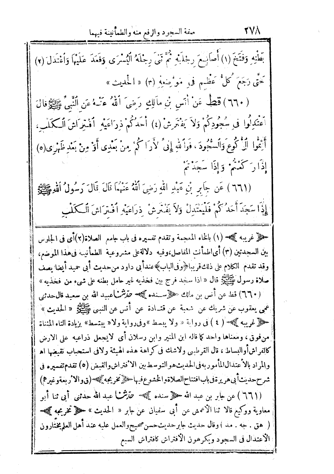 (غريبه) (1) بالخاء المعجمة وتقدم تفسيره في باب جامع الصلاة (2) أي في الجلوس بين السجدتين (3) أي اطمأنت المفاصل وفيه دلالة على مشروعية الطمأنينة في هذا الوضع وقد تقدم الكلام على ذلك قريباً (وفي الباب) عند أبي داود من حديث أبي حميد أيضاً يصف صلاة رسول الله صلى الله عليه وسلم قال " إذا سجد فرج بين فخذيه غير حامل بطنه على شيء من فخذيه " 660 قط عن أنس بن مالك (سنده) حدثنا عبيد الله بن سعيد قال حدثني عمي يعقوب عن شريك عن شعبة عن قتادة عن أنس عن النبي صلى الله عليه وسلم " الحديث " (غريبه) (4) في رواية " ولا يبسط " وفي رواية " يبتسط " بزيادة التاء المثناة من فوق ومعناها واحد كما قاله ابن المنير وابن رسلان أي لا يجعل ذراعيه على الأرض كالفراش أو البساط قال القرطبي ولا شك في كراهة هذه الهيئة ولا في استحباب نقيضها اهـ والمراد بالاعتدال المأمور به في الحديث هو التوسط بين الافتراش والقبض (5) تقدم تفسيره في شرح حديث أبي هريرة في باب افتتاح الصلاة والخشوع فيها (تخريجه) (ق والأربعة وغيرهم) 661 عن جابر بن عبد الله (سنده) حدثنا عبد الله حدثني أبي ثنا أبو معاوية ووكيع قالا ثنا الأعمش عن أبي سفيان عن جابر " الحديث " (تخريجه) (هق. جه. مد) وقال حديث جابر حديث حسن صحيح والعمل عليه عند أهل العلم يختارون الاعتدال في السجود ويكرهون الافتراش كافتراش السبع
