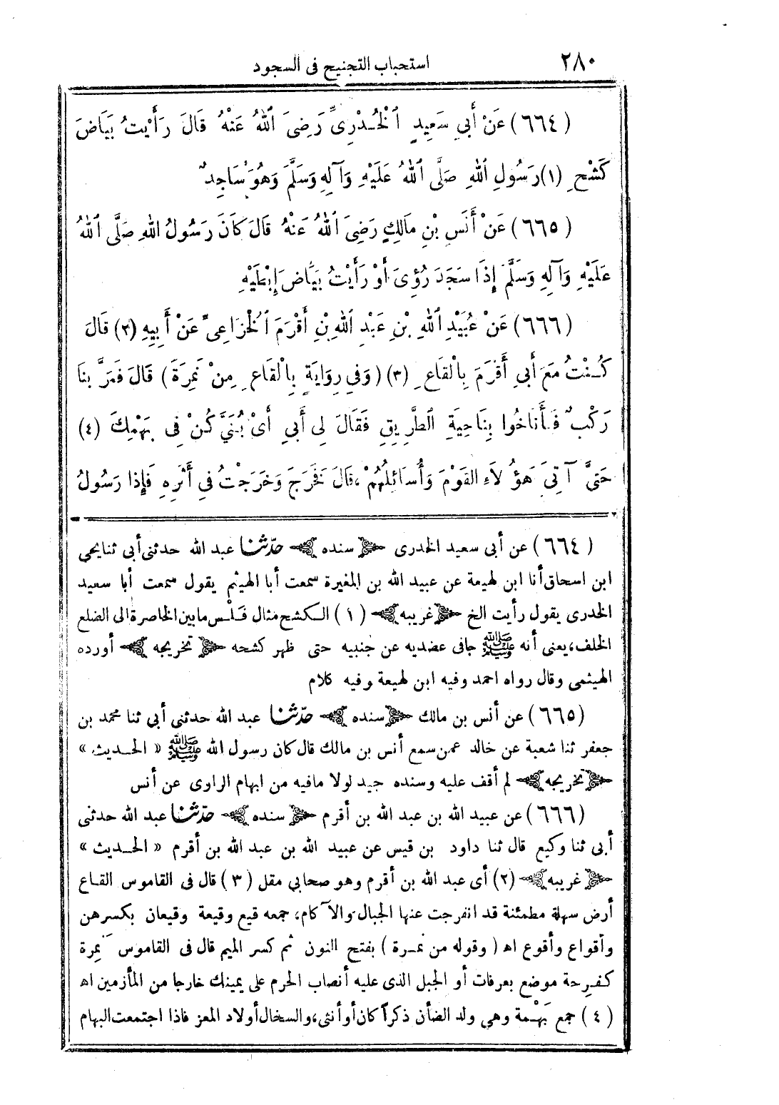 664 عن أبي سعيد الخدري (سنده) حدثنا عبد الله حدثني أبي ثنا يحيى ابن إسحاق أنا ابن لهيعة عن عبيد الله بن المغيرة سمعت أبا الهيثم يقول سمعت أبا سعيد الخدري يقول رأيت الخ (غريبه) (1) الكشح مثال فلس ما بخاصرة إلى الضلع الخلف يعني أنه صلى الله عليه وسلم جافى عضديه عن جنبيه حتى ظهر كشحه (تخريجه) أورده الهيثمي وقال رواه أحمد وفيه ابن لهيعة وفيه كلام 665 عن أنس بن مالك (سنده) حدثنا عبد الله حدثني أبي ثنا محمد بن جعفر ثنا شعبة عن خالد عمن سمع أنس بن مالك قال كان رسول الله صلى الله عليه وسلم " الحديث " (تخريجه) لم أقف عليه وسنده جيد لولا ما فيه من إبهام الراوي عن أنس 666 عن عبيد الله بن عبد الهرم (سنده) حدثنا عبد الله حدثني أبي ثنا وكيع قال ثنا داود بن قيس عن عبيد الله بن عبد الله بن أقرم " الحديث " (غريبه) (2) أي عبد الله بن أقرم وهو صحابي مقل (3) قال في القاموس القاع أرض سهلة مطمئنة قد انفرجت عنها الجبال والآكام جمعه قيع وقيعة وقيعان بكسرهن وأقواع وأقواع اهـ (وقوله من نمرة) بفتح النون ثم كسر الميم قال في القاموس نمرة كفرحة موضع بعرفات أو الجبل الذي عليه أنصاب الحرم علي يمينك خارجاً من المأزمين اهـ (4) جمع بهمة وهي ولد الضأن ذكراً كان أو أنثى والسخال أولاد المعز فإذا اجتمعت البهام