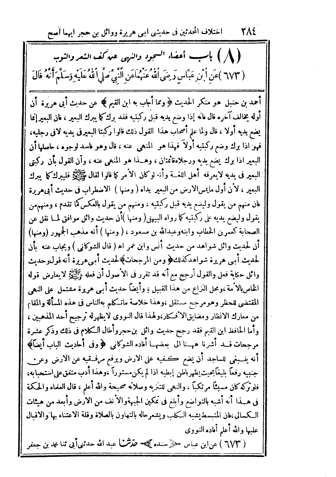 أحمد بن حنبل هو منكر الحديث (ومما أجاب به ابن القيم) عن حديث أبي هريرة أن أوله يخالف آخره قال فإنه إذا وضع يديه قبل ركبتيه فقد برك كما يبرك البعير فإن البعير إنما يضع يديه أولاً قال ولما علم أصحاب هذا القول ذلك قالوا ركبتا البعير في يديه لا في رجليه فهو إذا برك وضع ركبتيه أولا فهذا هو المنهي عنه قال وهو فاسد لوجوده حاصلها أن البعير إذا برك يضع يديه ورجلاه قائمتان وهذا هو المنهي عنه وأن القول بأن ركبتي البعير ف يديه لا يعرفه أهل اللغة وأنه لو كان الأمر كما قالوا صلى الله عليه وسلم فليبرك كما يبرك البعير لأن أول ما يمس الأرض من البعير يداه (ومنها) الاضطراب في حديث أبي هريرة فإن منهم من يقول وليضع يديه قبل ركبتيه ومنهم من يقول بالعكس كما تقدم ومنهم من يقول وليضع يديه على ركبتيه كما رواه البيهقي (ومنها) أن حديث وائل موافق لما نقل عن الصحابة كعمر بن الخطاب وابنه وعبد الله بن مسعود (ومنها) أنه مذهب الجمهور (ومنها) أن لحديث وائل شواهد من حديث أنس وابن عمر اهـ (قال الشوكاني) ويجنه بأن لحديث أبي هريرة شواهد كذلك (من المرجحات) لحديث أبي هريرة أنه قول وحديث وائل حكاية فعل والقول أرجح مع أنه قد تقرر في الأصول أن فعله صلى الله عليه وسلم لا يعارض قوله الخاص بالأمة ومحل النزاع من هذا القبيل وأيضا حديث أبي هريرة مشتمل على النهي المقتضي للحظر وهو مرجح مستقل وهذا خلاصة ما تكلم به الناس في هذه المسألة والمقام من معارك الأنظار ومضايق الأفكار ولهذا قال النووي لا يظهر له ترجيح أحد المذهبين وأما الحافظ ابن القيم فقد رجح حديث وائل بن حجر وأطال الكلام في ذلك وذكر عشرة مرجحات قد أشرنا ههنا على بعضها أفاده الشوكاني (وفي أحاديث الباب أيضاً) أنه ينبغي للساجد أن يضع كفيه على الأرض ويرفع مرفقيه عن الأرض وعن جنبيه رفعاً بليغاً بحيث يظهر باطن إبطيه إذا لم يكن مستوراً وهذا أدب متفق على استحبابه فلو تركه كان مسيئاً مرتكباً والنهي للتنزيه وصلاته صحيحة والله أعلم قال العلماء والحكمة في هذا أنه أشبه بالتواضع وأبلغ في تمكين الجبهة والأنف من الأرض وأبعد هيئات الكسالى فإن المتبسط يشبه الكلب ويشعر بالتهاون بالصلاة وقلة الاعتناء بها والإقبال عليها والله أعلم أفاده النووي 673 عن ابن عباس (سنده) حدثنا عبد الله حدثني أبي ثنا محمد بن جعفر