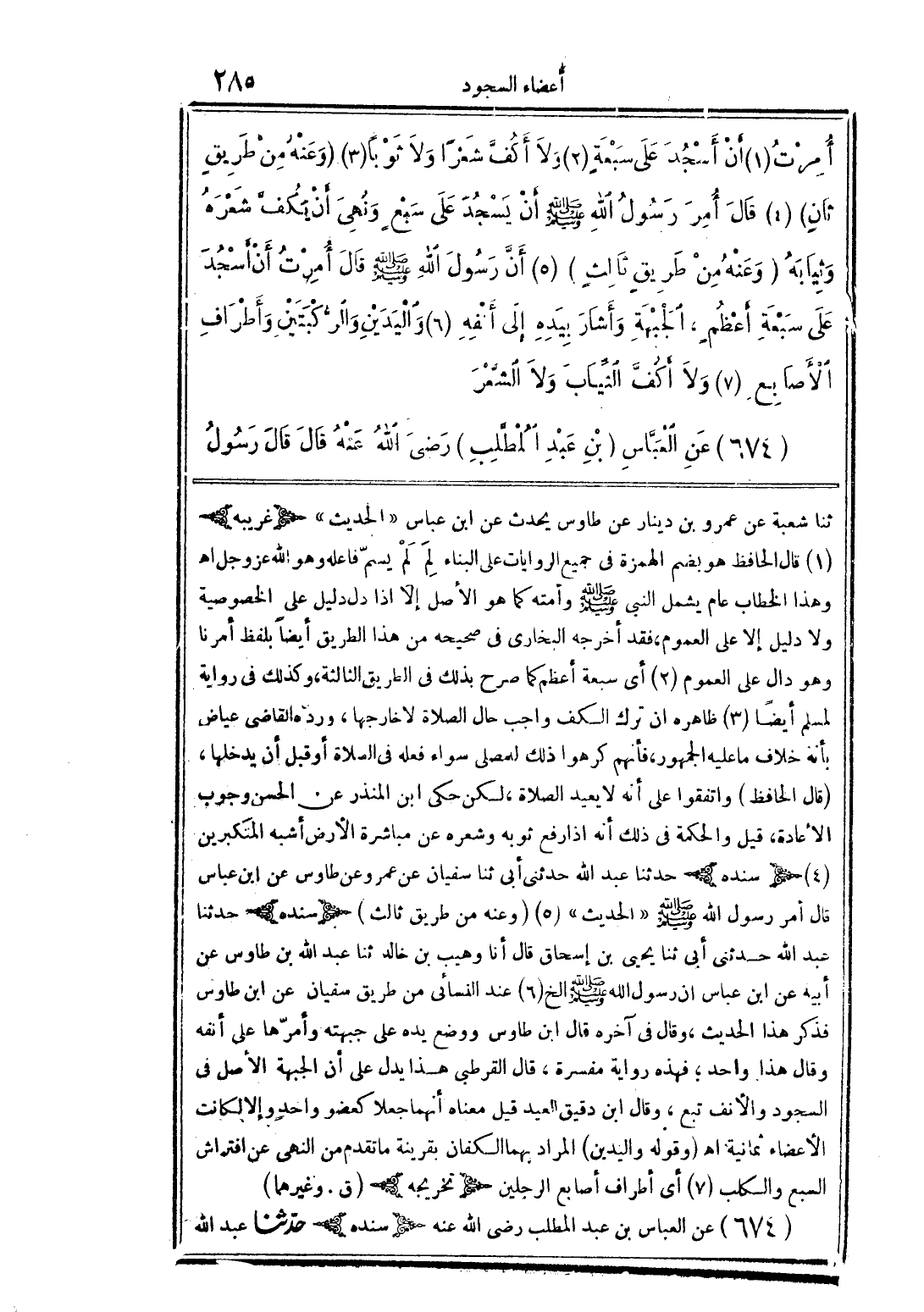 أمرت (1) أن أسجد على سبعةٍ (2) ولا أكفَّ شعرًا ولا ثوبًا (3) (وعنه من طريقٍ ثانٍ) (4) قال أمر رسول الله صلى الله عليه وسلم لأن يسجد على سبعٍ ونهى أن يكفَّ شعره وثيابه (وعنه من طريقٍ ثالثٍ) (5) أنَّ رسول الله صلى الله عليه وسلم قال أمرت أن أسجد على سبعة أعظمٍ، الجبهة وأشار بيده إلى أنفه (6) واليدين والركبتين وأطراف الأصابع (7) ولا أكف الثَّياب ولا الشعر