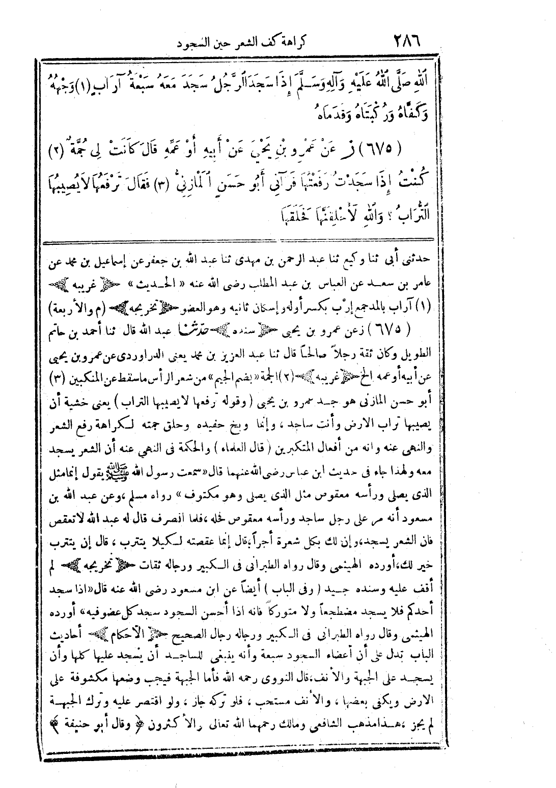 (675) ز عن عمرو بن يحيى عن أبيه أو عمِّه قال كانت لى جمَّةٌ (2) كنت إذا سجدت رفعتها فرآنى أبو حسنٍ المانُّى (3) فقال ترفعها لا يصيها التُّراب؟ والله لأحلقنها فحلقها