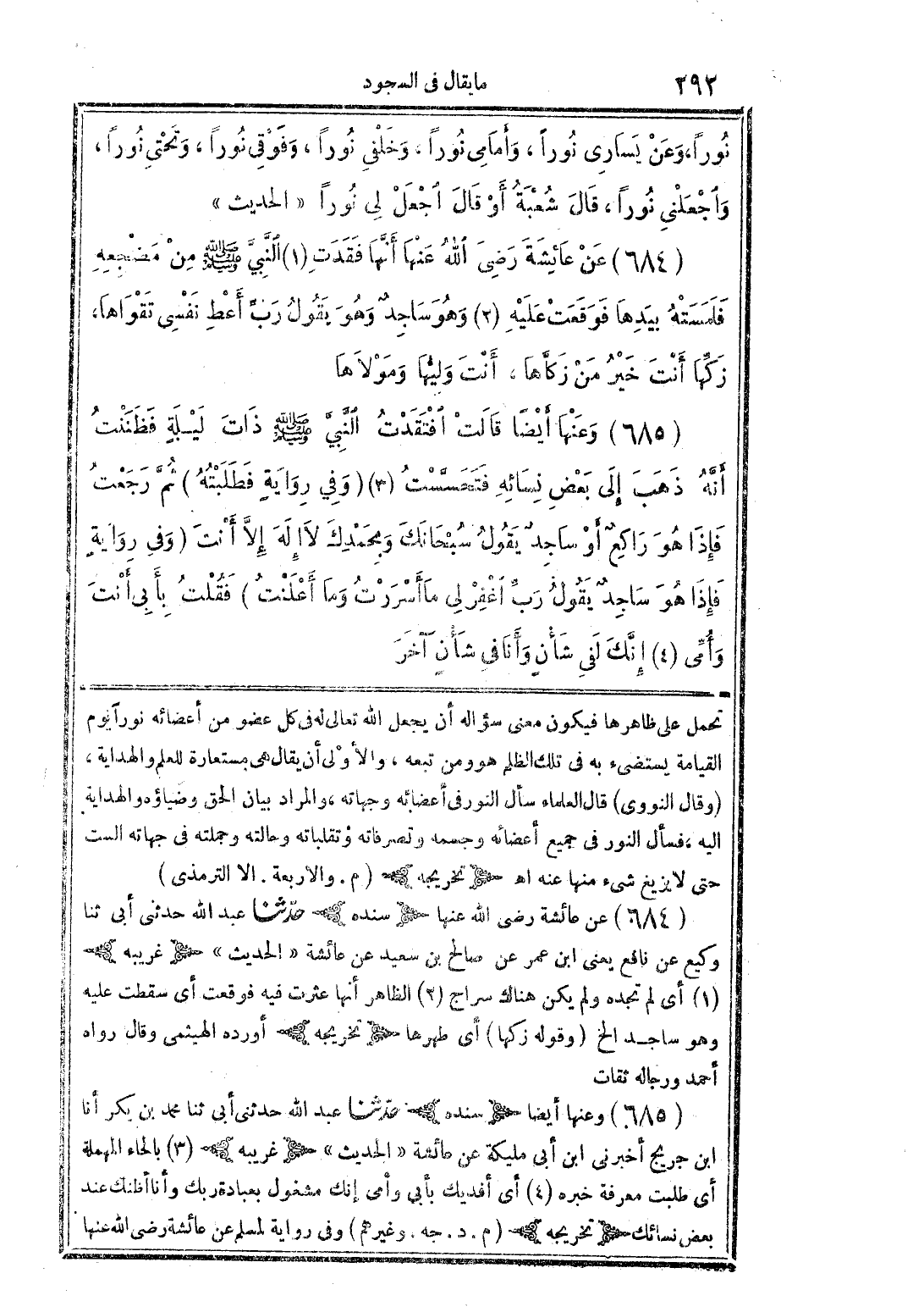 (685) وعنها أيضاً قالت افتقدت النَّبيَّ صلى الله عليه وسلم ذات ليليةٍ فظنت أنَّه ذهب إلى بعض نسائه فتحسَّست (3) (وفى روايةٍ فطلبته) ثمَّ رجعت فإذا هو راكعٌ أو ساجدٌ يقول سبحانك وبحمدك لا إله إلاَّ أنت (وفى روايةٍ فإذا هو ساجدٌ يقول ربِّ اغفر لى ما أسررت وما أعلنت) فقلت بأبى أنت وأمِّى (4) إنَّك لفى شأنٍ وأنا فى شأنٍ آخر