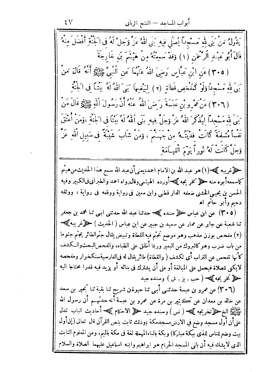 (305) عن ابن عباس رضي الله عنهما عن النبي صلى الله عليه وسلم أنه قال من بنى لله مسجداً ولو كمفحص قطاة (2) لبيضها بنى الله له بيتا في الجنة.