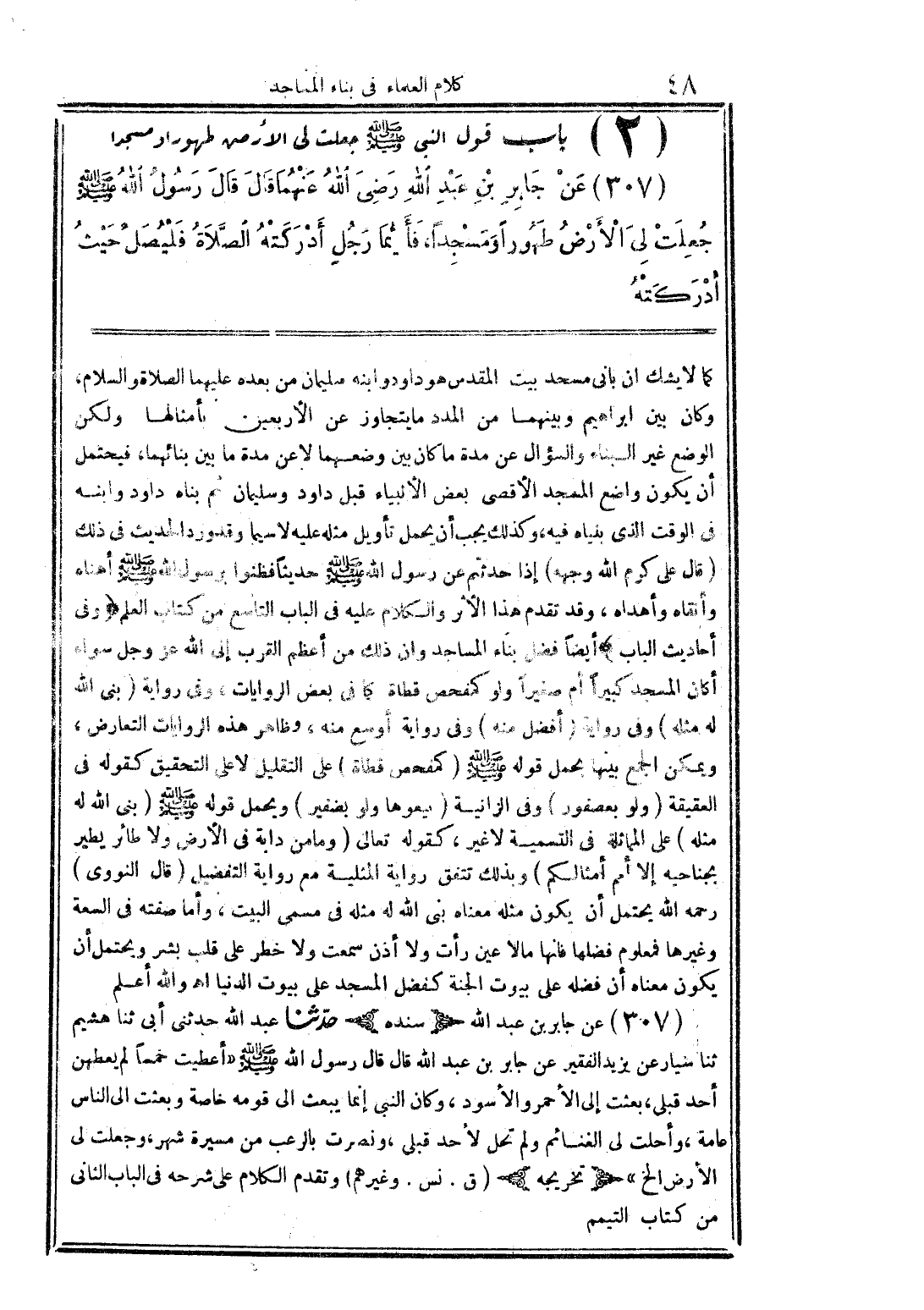(307) عن جابر بن عبد الله رضي الله عنهما قال قال رسول الله صلى الله عليه وسلم جعلت لي الأرض طهوراً ومسجداً، فأيما رجل أدركته الصلاة فليصل حيث أدركته