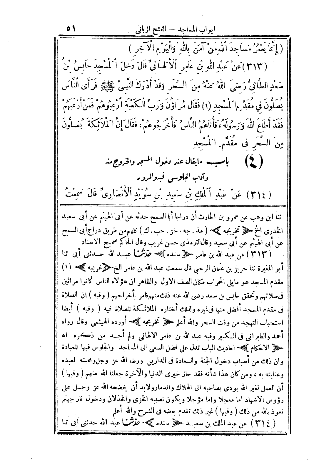 (313) عن عبد الله بن عامر الألهانىِّ قال دخل المسجد حابس بن سعدٍ الطَّائى رضى الله عنه من السَّحر وقد أدرك النَّبىِّ صلى الله عليه وسلم فرأى النَّاس يصلَُّون في مقدَّم المسجد (1) فقال مراؤن وربِّ الكعبة ارعبوهم فمن أرعبهم فقد أطاع الله ورسوله، فأتاهم النَّاس فأخرجوهم، فقال إنَّ الملائكة يصلُّون من السَّحر في مقدَّم المسجد.