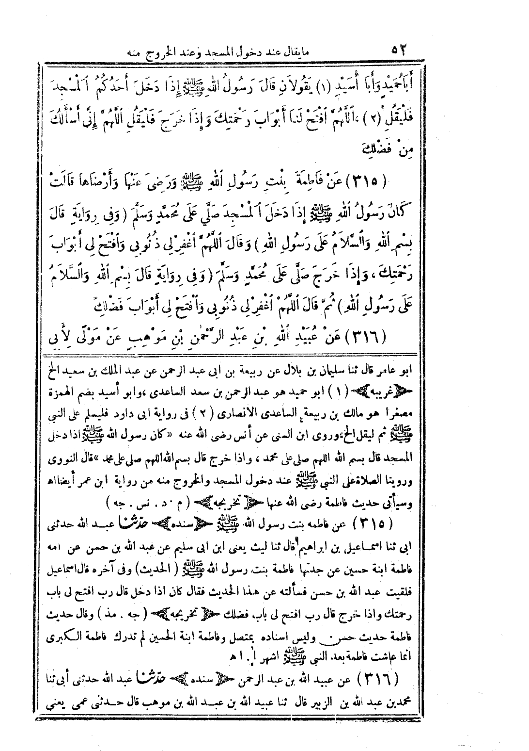 (315) عن فاطمة بنت رسول الله صلى الله ورضى عنها وأرضاها قالت كان رسول الله صلى الله إذا دخل المسجد صلَّى على محمَّد وسلَّم (وفى رواية قال بسم الله والسَّلام على رسول الله) وقال اللَّهم اغفر لى ذنوبى وافتح لى أبواب رحمتك، وإذا خرج صلَّى على محمِّد وسلِّم (وفى رواية قال بسم الله والسَّلام على رسول الله) ثمَّ قال اللَّهم اغفر لى ذنوبي وافتح لى أبواب فضلك.