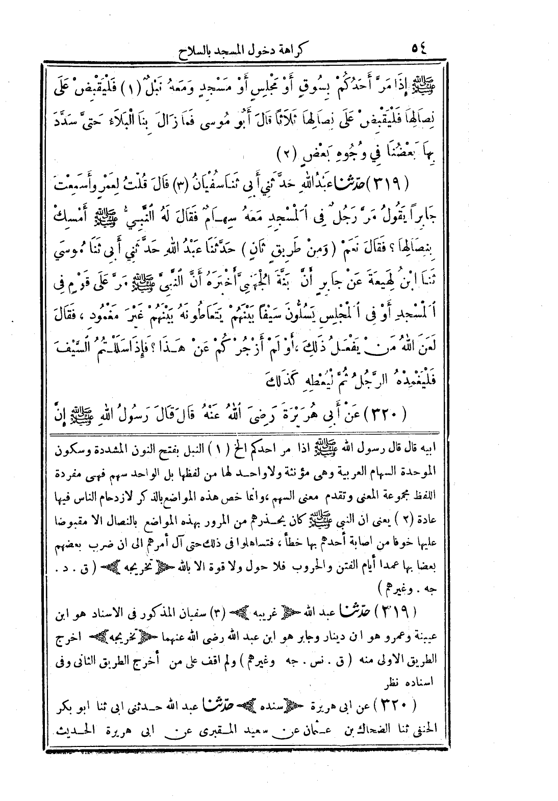 (319) حدّثنا عبد الله حدَّثنى أبى ثنا سفيان (3) قال قلت لعمرٍ وأسمعت جابرًا يقول مرَّ رجلٌ فى المسجد معه سهامٌ فقال له النَّبىُّ صلى الله عليه وسلم أمسك بنصالها؟ فقال نعم (ومن طريقٍ ثانٍ) حدَّثنا عبد الله حدَّثنى أبى ثنا موسى ثنا ابن لهيعة عن جابرٍ أنَّ بنَّة الجهنىَّ أخبره أنَّ النَّبىَّ صلى الله عليه وسلم مرَّ على قومٍ فى المسجد أو فى المجلس يسلُّون سيفًا بينهم يتعاطونه بينهم غير مغمود، فقال لعن الله من يفعل ذلك، أو لم أزجركم عن هذا؟ فإذا سللتم السَّيف فليغمده الرَّجل ثمَّ ليعطه كذلك.