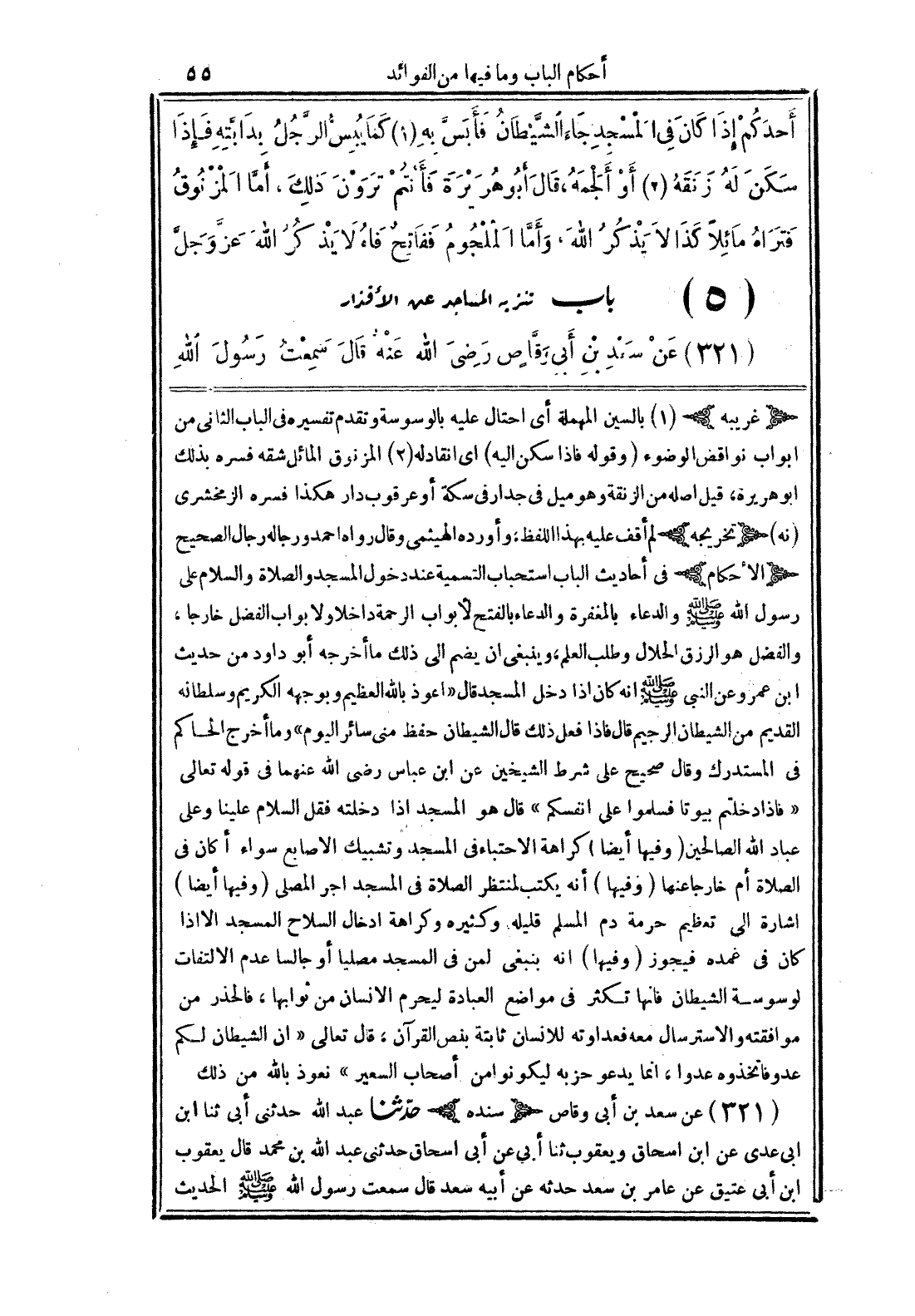 (غريبه) (1) بالسين المهملة اى احتال عليه بالوسوسة وتقدم تفسيره فى الباب الثانى من ابواب نواقض الوضوء (وقوله فاذا سكن اليه) اى انقاد له (2) المزنوق المائل شقه فسره بذلك ابو هريرة، قيل اصله من الزنقة وهو ميل فى جدار فى سكة أو عرقوب دار هكذا فسره الزمخشرى (نه) (تخريجه) ام أقف عليه بهذا اللفظ، وأورده الهيثمى وقال رواه احمد ورجاله رجال الصحيح (الأحكام) فى أحاديث الباب استحباب التسمية عند دخول المسجد والصلاة والسلام على رسول الله صلى الله عليه وسلم والدعاء بالمغفرة والدعاء بالفتح لأبواب الرحمة داخلًا ولابواب الفضل خارجًا، والفضل هو الرزق الحلال وطلب العلم، وينبغى ان يضم الى ذلك ما أخرجه أبو داود من حديث ابن عمر وعن النبى صلى الله عليه وسلم انه كان اذا دخل المسجد قال ((اعوذ بالله العظيم وبوجهه الكريم وسلطانه القديم من الشيطان الرجيم قال فاذا فعل ذلك قال الشيطان حفظ منى سائر اليوم)) وما أخرج الحاكم فى المستدرك وقال صحيح على شرط الشيخين عن ابن عباس رضى الله عنهما فى قوله تعالى {فاذا دخلتم بيوتًا فسلموا على انفسكم} قال هو المسجد اذا دخلته فقل السلام علينا وعلى عباد الصالحين (وفيها أيضًا) كراهة الاحتباء فى المسجد وتشبيك الاصابع سواء أكان فى الصلاة أم خارجًا عنها (وفيها) أنه يكتب لمنتظر الصلاة فى المسجد اجر المصلى (وفيها أيضًا) اشارة الى تعظيم حرمة دم المسلم قليله وكثيره وكراهة ادخال السلاح المسجد الا اذا كان غمده فيجوز (وفيها) انه ينبغى لمن فى المسجد مصليًا أو جالسًا عدم الالتفات لوسوسة الشيطان فانها تكثر فى مواضع العبادة ليحرم الانسان من ثوابها، فالحذر من موافقته والاسترسال معه فعداوته للانسان ثابتة بنص القرآن، قال تعالى {ان الشيطان لكم عدو فاتخذوه عدوًا، انما يدعو حزبه ليكونوا أصحاب السعير} نعوذ بالله من ذلك