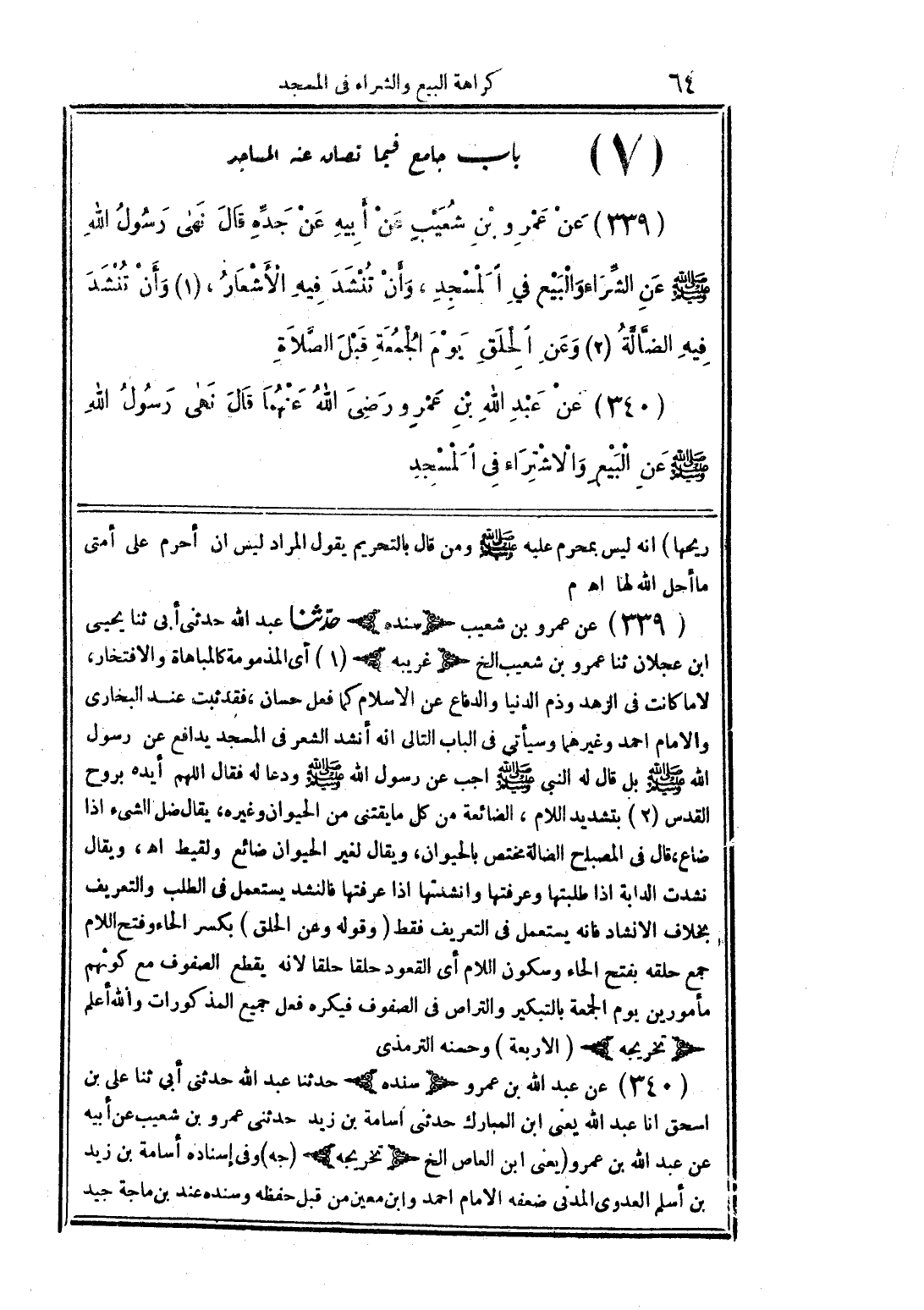 (340) عن عبد الله بن عمرو رضى الله عنهما قال نهى رسول الله صلى الله عليه وسلم عن البيع والاشتراء في المسجد