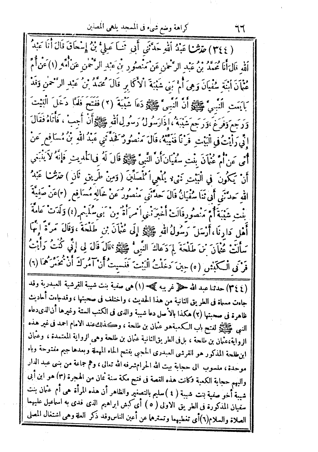 (344) حدّثنا عبد الله حدَّثنى أبى ثنا علىُّ بن إسحاق قال أنا عبد الله قال أنا محمَّد بن عبد الرَّحمن عن منصور بن عبد الرَّحمن عن أمِّه (1) عن أمِّ عثمان ابنة سفيان وهى أمُّ بنى شيبة الأكابر قال محمَّد بن عبد الرَّحمن وقد بايعت النَّبىَّ صلى الله عليه وسلم دعا شيبة (2) ففتح فلمَّا دخل البيت ورجع وفرغ، ورجع شيبة، إذا رسول رسول الله صلى الله عليه وسلم أن أجب، فأتاه فقال إنِّى رأيت فى البيت قرنًا فغيِّبه، قال منصورٌ فحدَّثنى عبد الله بن مسافع عن أمِّى عن أمِّ عثمان بنت سفيان أنَّ النَّبىَّ صلى الله عليه وسلم قال له فى الحديث فإنَّه لا ينبغى أن يكون فى البيت شئ لا يلهى المصلِّين (ومن طريقٍ ثانٍ) حدّثنا عبد الله حدَّثنى أبى ثنا سفيان قال حدَّثنى منصورٌ عن خالة مسافع (3) عن صفيَّة بنت شيبة أمَّ منصورٍ قالت أخبرتني امرأةٌ من بنى سليمٍ (4) ولدت عامَّة أهل دارنا، أرسل رسول الله صلى الله عليه وسلم إلى عثمان بن طلحة، وقال مرَّة إنَّها سألت عثمان بن طلحة لم دعاك النَّبىُّ صلى الله عليه وسلم؟ قال قال لى إنِّى كنت رأيت قرنى الكبش (5) حين دخلت البيت فنسيت أن آمرك أن تخمِّرهما (6)