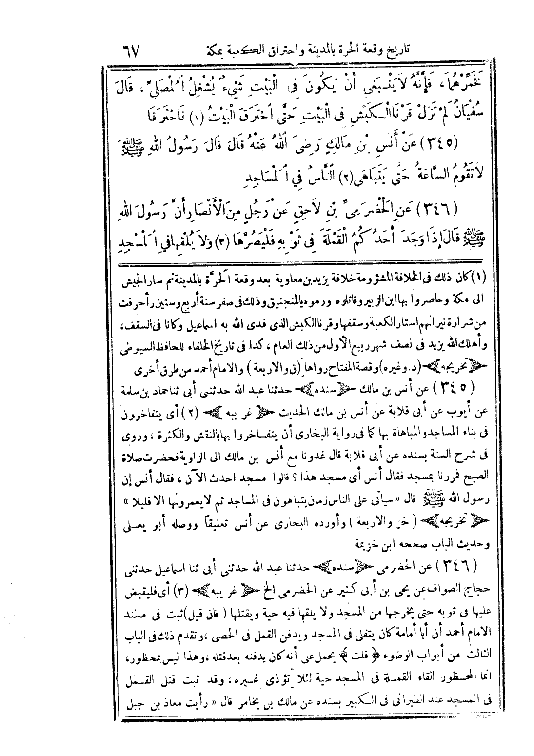 (1) كان ذلك في الخلافة المشؤومة خلافة يزيد بن معاوية بعد وقعة الحرة بالمدينة ثم سار الجيش إلى مكة وحاصروا بها ابن الزبير وقاتلوه ورموه بالمنجنيق وذلك في صفر سنة أربع وستين وأحرقت من شرارة نيرانهم استار الكعبة وسقفها وقرنا الكبش الذي فدى الله به اسماعيل وكانا في السقف وأهلك الله يزيد في نصف شهر ربيع الاول من ذلك العام كدا في تاريخ الخلفاء للحافظ السيوطي (تخريجه) (د. وغيره) وقصة المفتاح رواها (ق والاربعة) والامام احمد من طرق اخرى (345) عن أنس بن مالك (سنده) حدثنا عبد الله حدثني عبد الله حدثني ابي ثنا حماد سلمة عن أيوب عن ابي قلابة عن أنس بن نالك الحديث (غريبه) (2) أي يتفاخرون في بناء المساجد والمباهاة بها كما في رواية البخاري أن يتفاخروا بها بالنقش والكثرة وروي في شرح السنة بسنده عن أبي قلابة قال غدونا مع أنس بن مالك إلى الزاوية فحضرت صلاة الصبح فمررنا بمسجد فقال أنس أي مسجد هذا؟ قالوا مسجد احدث الآن فقال أنس إن رسول الله صلى الله عليه وسلم قال "سيأتي على الناس زمان يتباهون في المساجد ثم لا يعمرونها الا قليلا" (تخريجه) (خز والاربعة) واورده البخاري عن أنس تعليقا ووصله أبو يعلى وحديث الباب صححه ابن خزيمة (346) عن الحضرمي (سنده) حدثنا عبد الله حدثني أبي ثنا اسماعيل حدثني حجاج الصواف عن يحي بن أبي كثير عن الحضرمي الخ (غريبه) (3) أي فليقبض عليها في ثوبه حتى يخرجها من المسجد ولا يلقها فيه حية ويقتلها (فان قيل) ثبت في مسند الامام احمد ان ابا امامة كان يتفلى في المسجد ويدفن القمل في الحصى وتقدم ذلك في الباب الثالث من أبواب الوضوء (قلت) يحمل على أنه كان يدفنه بعد قتله وهذا ليس بمحظور أنما المحظور القاء القملة في المسجد حية لئلا تؤذي غيره وقد ثبت قتل القمل في المسجد عند الطبراني في الكبير بسنده عن مالك بن يخامر قال "رأيت معاذ بن جبل