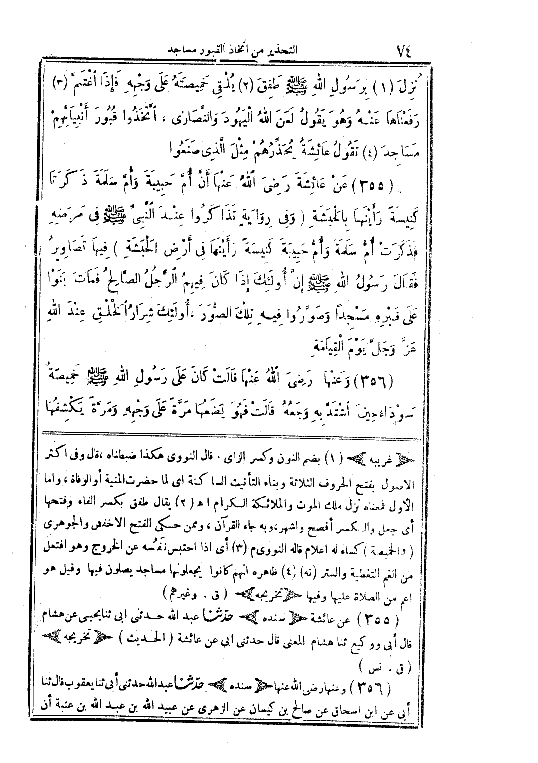 نزل (1) برسول الله صلى الله عليه وسلم طفق (2) يلقى خميصته على وجهه فإذا اغتمَّ (3) رفعناها عنه وهو يقول لعن الله اليهود والنَّصارى، اتَّخذوا قبور أنبيائهم مساجد (4) تقول عائشة يحذِّرهم مثل الَّذى صنعوا
