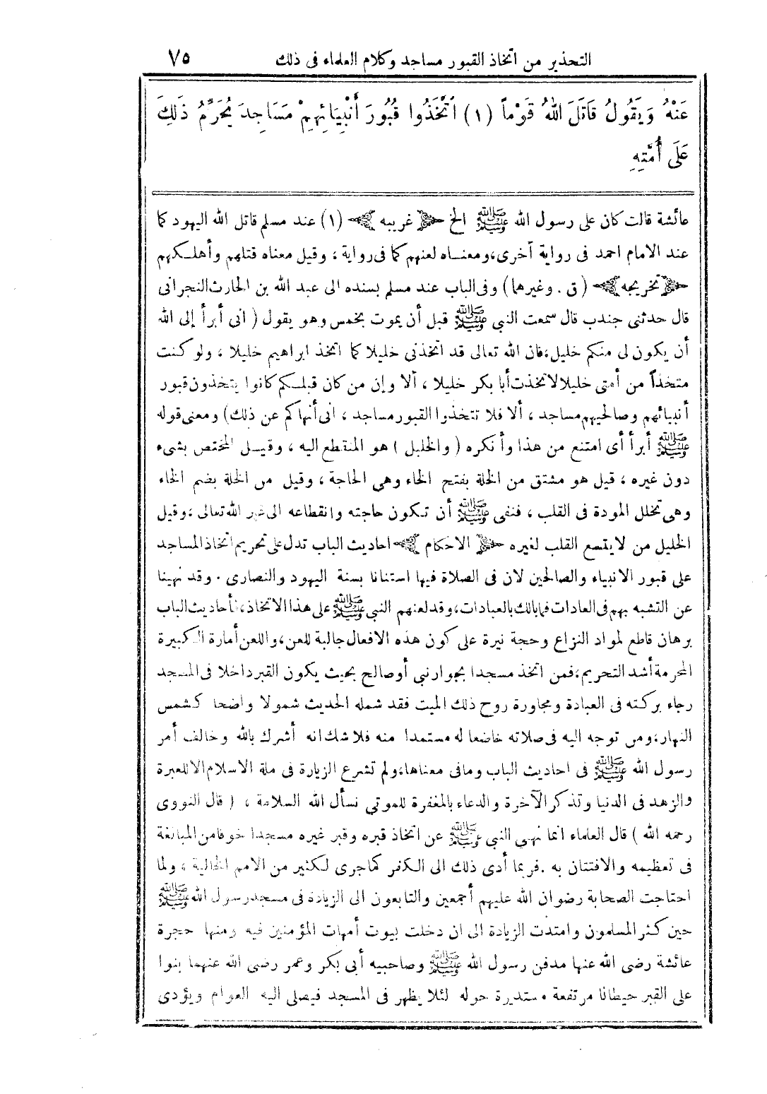 عنه ويقول قاقل الله قومًا (1) اتخذوا قبور أنبيائهم مساجد يحرِّم ذلك على أمته