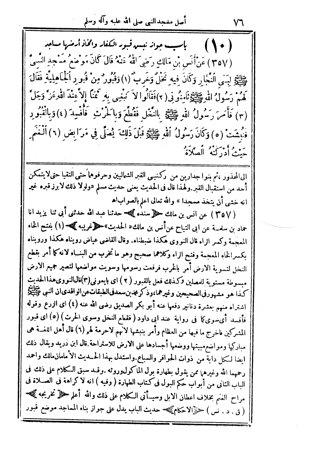 (357) عن أنس بن مالك رضى الله عنه قال كان موضع مسجد النَّبىِّ صلى الله عليه وسلم لبنى النَّجار وكان فيه نخلٌ وخربٌ (1) وقبورٌ من قبور الجاهليِّة فقال لهم رسول الله صلى الله عليه وسلم ثامنونى (2) فقالوا لا نبغى به ثمنًا إلاَّ عند الله عزَّ وجلَّ (3) فأمر رسول الله صلى الله عليه وسلم بالنَّخل فقطَّع وبالحرث فأفسد (4) وبالقبور فنبشت (5) وكان رسول الله صلى الله عليه وسلم قبل ذلك يصلِّى فى مرابض (6) الغنم حيث أدركته الصَّلاة