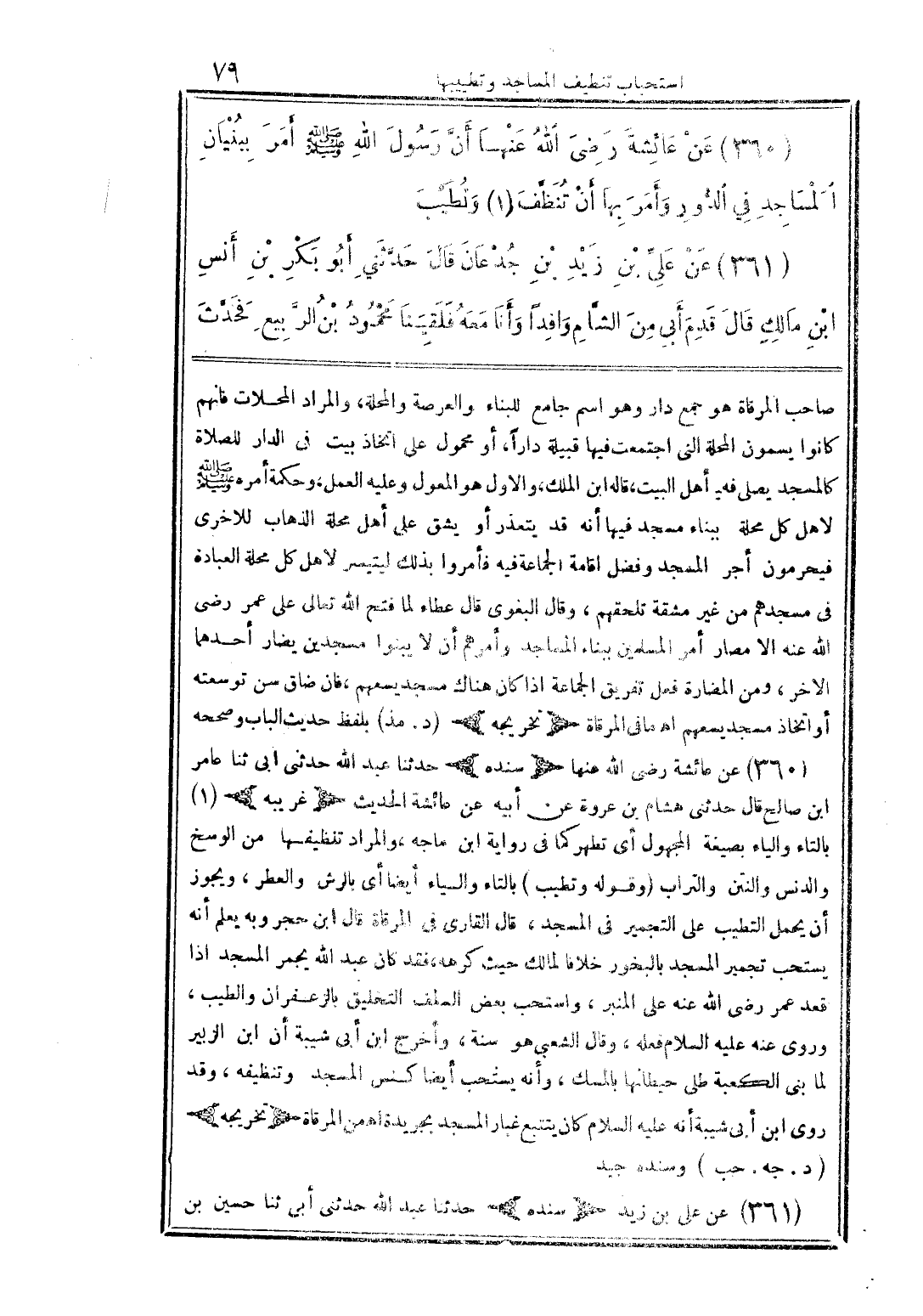 (360) عن عائشة رضى الله عنها أن رسول الله صلى الله عليه وسلم أمر ببنيان المساجد فى الدور وأمر بها أن تنظَّف (1) وتطيب