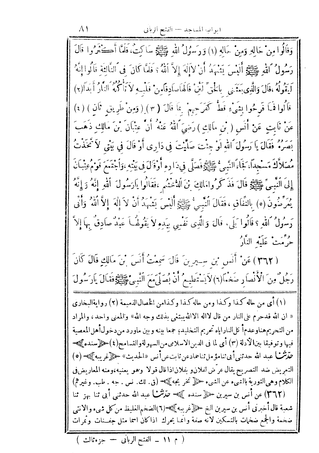 (1) أي من حاله كذا وكذا ومن حاله كذا وكذا من الخصال الذميمة (2) رواية البخاري " إن الله قد حرم على النار من قال لا إله إلا الله يبتغي بذلك وجه الله " والمعنى واحد، والمراد من التحريم هنا وعدم أكل النار إياه تحريم التخليد؛ جمعا بينه وبين ما ورد من دخول أهل المعصية فيها وتوفيقا بين الأدلة (3) أي لما في الدين الإسلامي من السهولة والتسامح (4) {سنده} حدثنا عبد الله حدثني أبي ثنا مؤمل ثنا حماد عن ثابت عن أنس "الحديث" {غريبه} (5) التعريض ضد التصريح يقال عرّض لفلان وبفلان إذا قال قولا وهو يعنيه، ومنه المعاريض في الكلام وهي التورية بالشئ عن الشئ {تخريجه} (ق. لك. نس. جه. طب. وغيرهم)