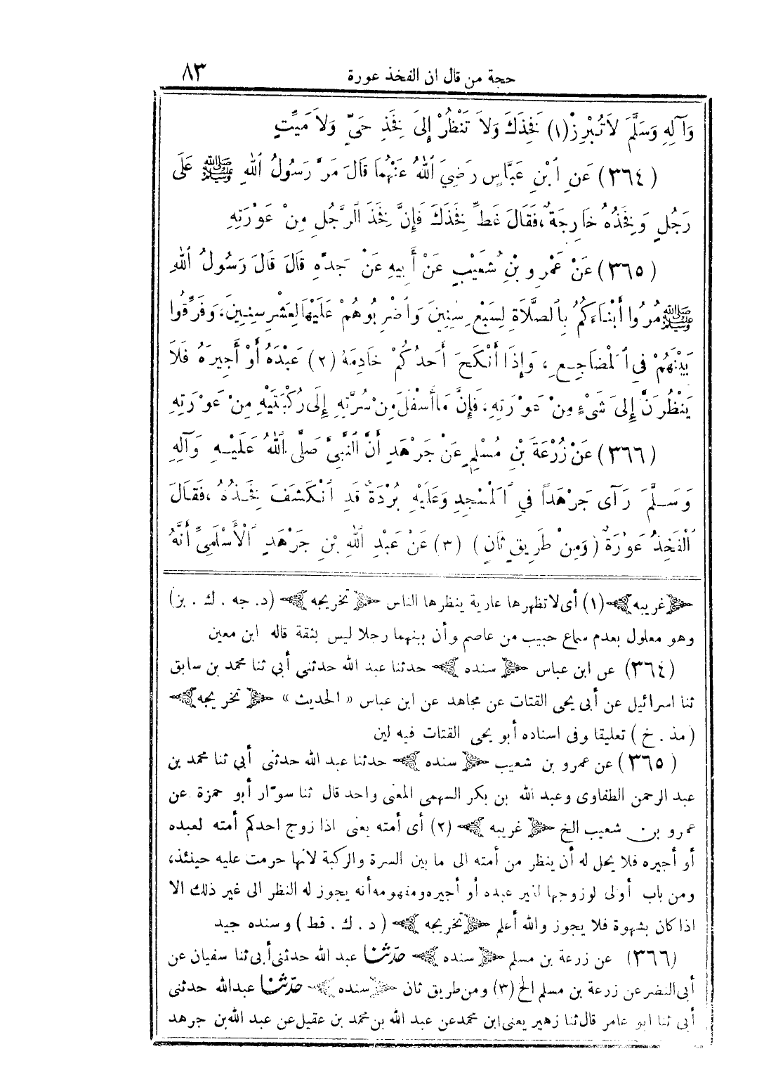 (366) عن زرعة بن مسلمٍ عن جرهد أنَّ النَّبىَّ صلَّى الله عليه وآله وسلَّم رآى جرهدًا في المسجد وعليه بردة قد انكشف فخذه، فقال الفخذ عورةٌ (ومن طريقٍ ثانٍ) (3) عن عبد الله بن جرهدٍ الأسلمي أنَّه