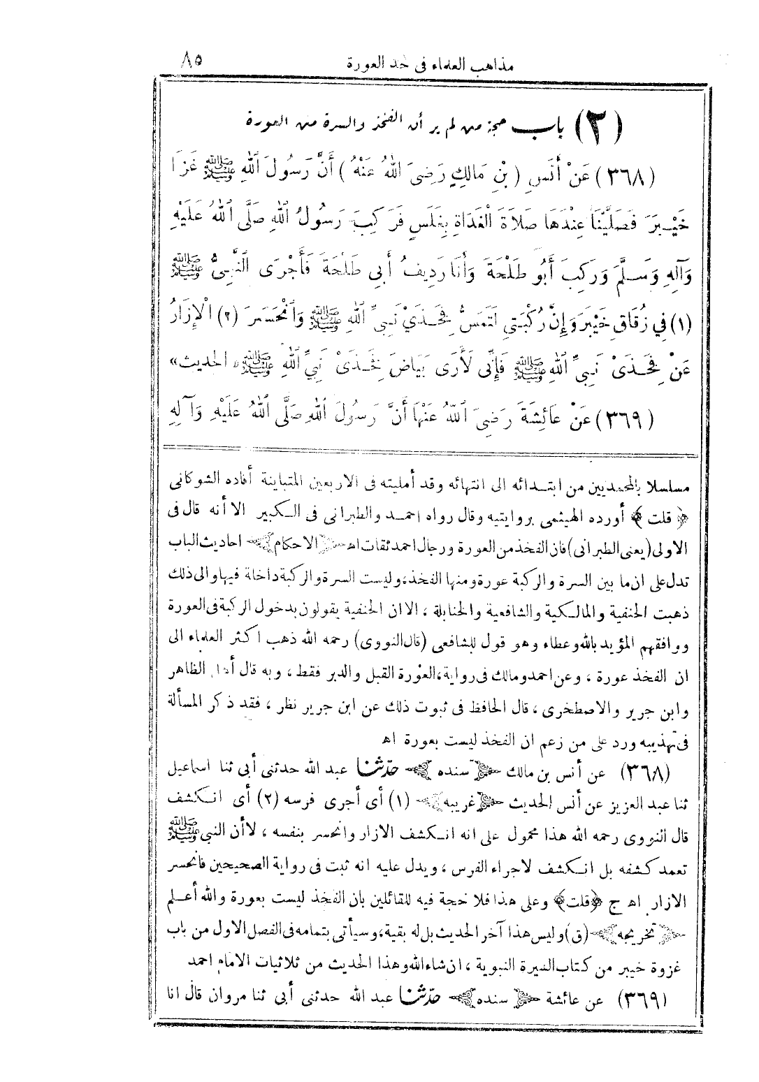 (368) عن أنس (بن مالكٍ رضى الله عنه) أنَّ رسول الله صلى الله عليه وسلم غزا خيبر فصلَّينا عندها صلاة الغداة بغلسٍ فركب رسول الله صلَّى الله عليه وآله وسلَّم وركب أبو طلحة وأنا رديف أبى طلحة فأجرى النَّبىُّ صلى الله عليه وسلم (1) في زقاق خيبر وإنَّ ركبتى لتمسُّ فخذي نبيِّ الله صلى الله عليه وسلم وانحسر (2) الإزار عن فخذى نبيِّ الله صلى الله عليه وسلم فإنِّى لأرى بياض فخذى نبيِّ الله صلى الله عليه وسلم ((الحديث))