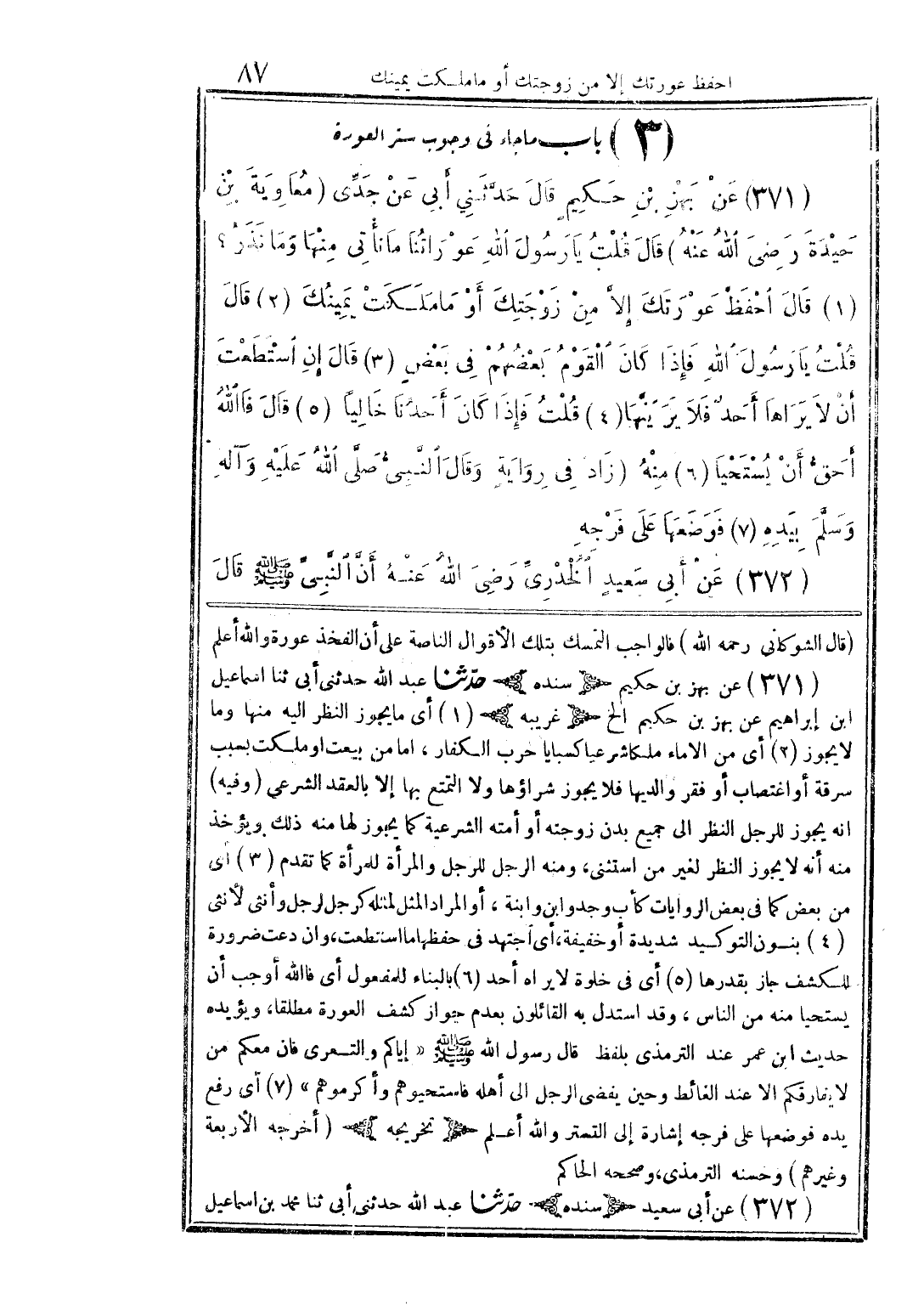 (371) عن بهز بن حكيمٍ قال حدَّثني أبى عن جدِّى (معاوية بن حيدة رضى الله عنه) قال قلت يا رسول الله عوراتنا ما نأتى منها وما نذر؟ (1) قال احفظ عورتك إلَّا من زوجتك أو ما ملكت يمينك (2) قال قلت ي رسول الله فإذا كان القوم بعضهم فى بعضٍ (3) قال إن استطعت أن لا يراها أحدٌ فلا يرينَّها (4) قلت فإذا كان أحدنا خاليًا (5) قال فالله أحقُّ أن يستحيا (6) منه (زاد فى رواية وقال النَّبىُّ صلَّى الله عليه وآله وسلَّم بيده (7) فوضعها على فرجه