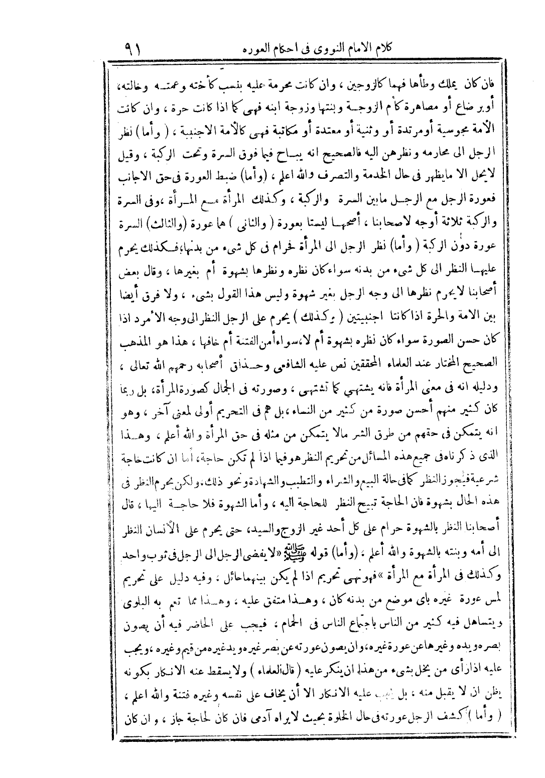 فإن كان يملك وطأها فهما كالزوجين وإن كانت محرمة عليه بنسب كأخته وعمته وخالته أو برضاع أو مصاهرة كأم الزوجة وبنتها وزوجة ابنه فهي كما إذا كانت حرة وإن كانت الأمة مجوسية أو مرتدة أو وثنية أو معتدة أو مكاتبة فهي كالأمة الأجنبية (وأما) نظر الرجل إلى محارمه ونظرهن إليه فالصحيح أنه يباح فيما فوق السرة وتحت الركبة وقيل لا يحل إلا ما يظهر في حال الخدمة والتصرف والله أعلم (وأما) ضبط العورة في حق الأجانب فعورة الرجل مع الرجل ما بين السرة والركبة وكذلك المرأة مع المرأة وفي السرة والركبة ثلاثة أوجه لأصحابنا أصحها ليستا بعورة (والثاني) هما عورة (والثالث) السرة عورة دون الركبة (وأما) نظر الرجل إلى المرأة فحرام في كل شيء من بدنها فكذلك يحرم عليها النظر إلى كل شيء في بدنه سواء كان نظره ونظرها بشهوة أم بغيرها وقال بعض أصحابنا لا يحرم نظرها إلى وجه الرجل بغير شهوة وليس هذا القول بشيء ولا فرق أيضاً بين الأمة والحرة إذا كانتا أجنبيتين (وكذلك) يحرم على الرجل النظر إلى وجه الأمر إذا كان حسن الصورة سواء كان نظره بشهوة أم لا سواء أمن الفتنة أم خافها هذا هو المذهب الصحيح المختار عند العلماء المحققين نص عليه الشافعي وحذاق أصحابه رحمهم الله تعالى ودليله أنه في معنى المرأة فإنه يشتهي كما تشتهي وصورته في الجمال كصورة المرأة بل ربما كان كثير منهم أحسن صورة من كثير من النساء بل هم في التحريم أولى لمعنى آخر وهو أنه يتمكن في حقهم من طرق الشر مالا يتمكن من مثله في حق المرأة والله أعلم وهذا الذي ذكرناه في جميع هذه المسائل من تحريم النظر هو فيما إذا لم تكن حاجة أما إن كانت حاجة شرعية فيجوز النظر كما في حالة البيع والشراء والتطبب والشهادة ونحو ذلك ولكن يحرم النظر في هذه الحال بشهوة فإن الحاجة تبيح النظر للحاجة إليه وأما الشهوة فلا حاجة إليها قال أصحابنا النظر بالشهوة حرام على كل أحد غير الزوج والسيد حتى يحرم على الإنسان النظر إلى أمه وبنته بالشهوة والله أعلم (وأما) قوله صلى الله عليه وسلم " لا يفضى الرجل إلى الرجل في ثوب واحد وكذلك في المرأة مع المرأة فهو نهى تحريم إذا لم يكن بينهما حائل وفيه دليل على تحريم لمس عورة غيره بأي موضع من بدنه كان وهذا متفق عليه وهذا مما تعم به البلوى ويتساهل فيه كثير من الناس باجتماع الناس في الحمام فيجب على الحاضر فيه أن يصون بصره ويده وغيره عن عورة غيره وأن يصون عورته عن بصر غيره ويد غيره من قيم وغيره ويجب عليه إذا رأى من يخل بشيء من هذا أن ينكر عليه (قال العلماء) ولا يسقط عنه الإنكار بكونه يظن أن لا يقبل منه بل يجب عليه الإنكار إلا أن يخاف على نفسه وغيره فتنة والله أعلم (وأما) كشف الرجل عورته في حال الخلوة بحيث لا يراه آدمي فإن كان لحاجة جاز وإن كان