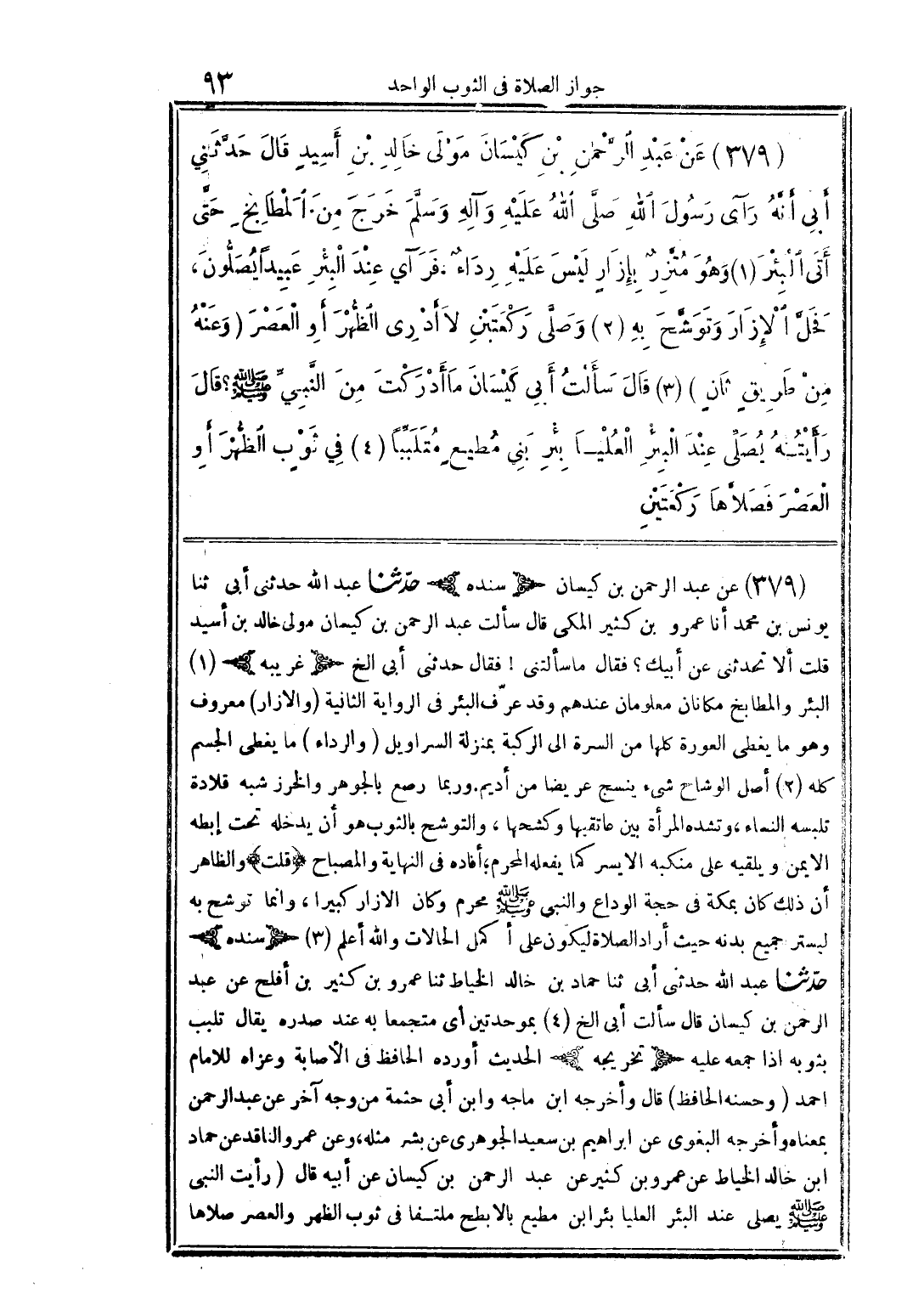 (379) عن عبد الرَّحمن بن كيسان مولى خالد بن أسيدٍ قال حدَّثني أبى أنَّه رآى رسول الله صلَّى الله عليه وآله وسلَّم خرج من المطابخ حتَّى أتى البئر (1) وهو متَّزرٌ بإزار ليس عليه رداءٌ، فرآى عند البئر عبيدًا يصلُّون، فحلَّ الإزار وتوشَّح به (2) وصلَّى ركعتين لا أدرى الظُّهر أو العصر (وعنه من طريقٍ ثانٍ) (3) قال سألت أبى كيسان ما أدركت من النَّبيِّ صلى الله عليه وسلم؟ قال رأيته يصلِّى عند البئر العليا بئر بنى مطيعٍ متلبِّبًا (4) فى ثوبٍ الظُّهر أو العصر فصلَّاها ركعتين