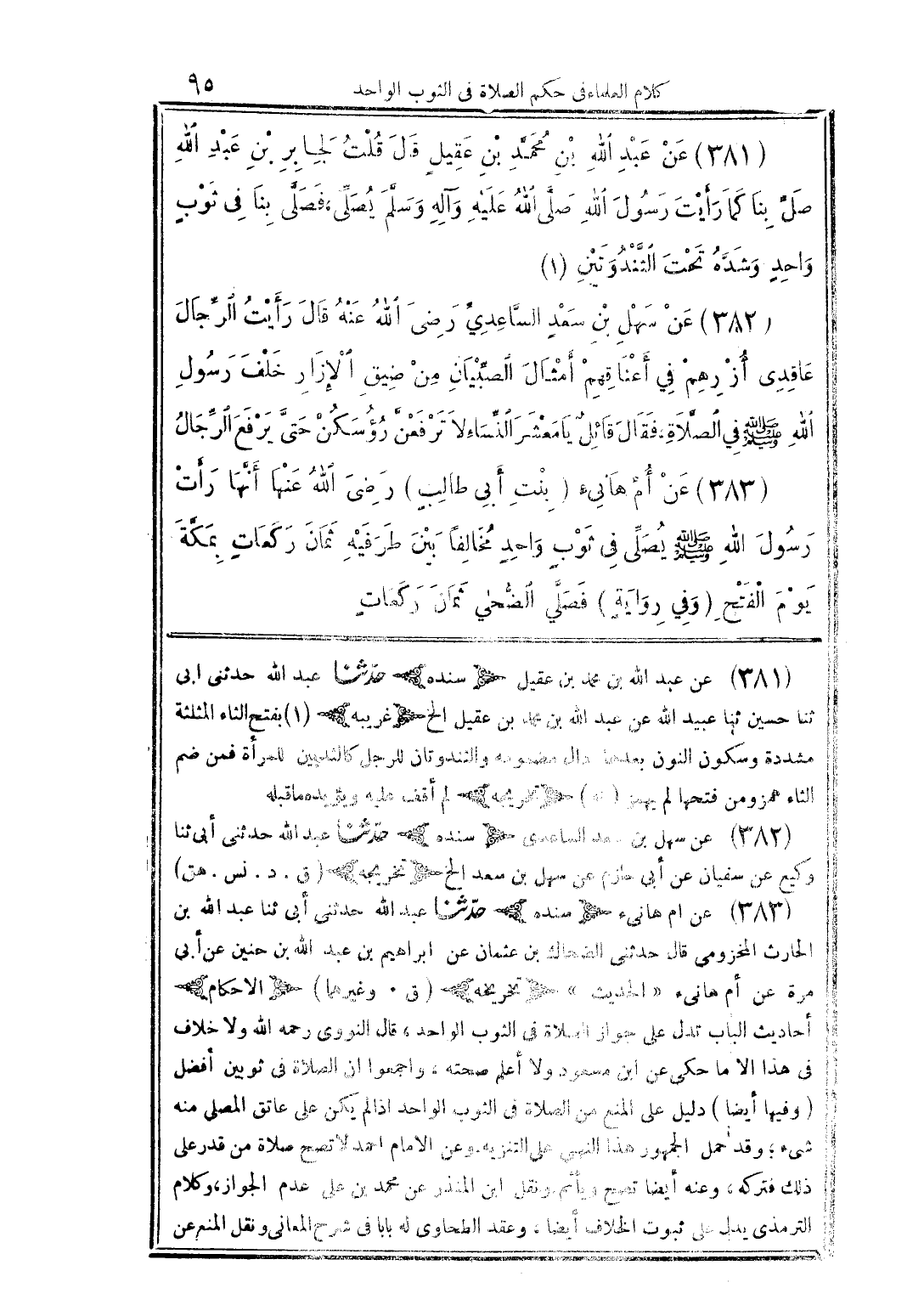 (381) عن عبد الله بن محمِّد بن عقيل قال قلت لجابر بن عبد الله صلَّ بنا كما رأيت رسول الله صلَّى الله عليه وآله وسلَّم يصلَّى، فصلَّى بنا فى ثوبٍ واحدٍ وشدَّه تحت التَّندوتين (1)