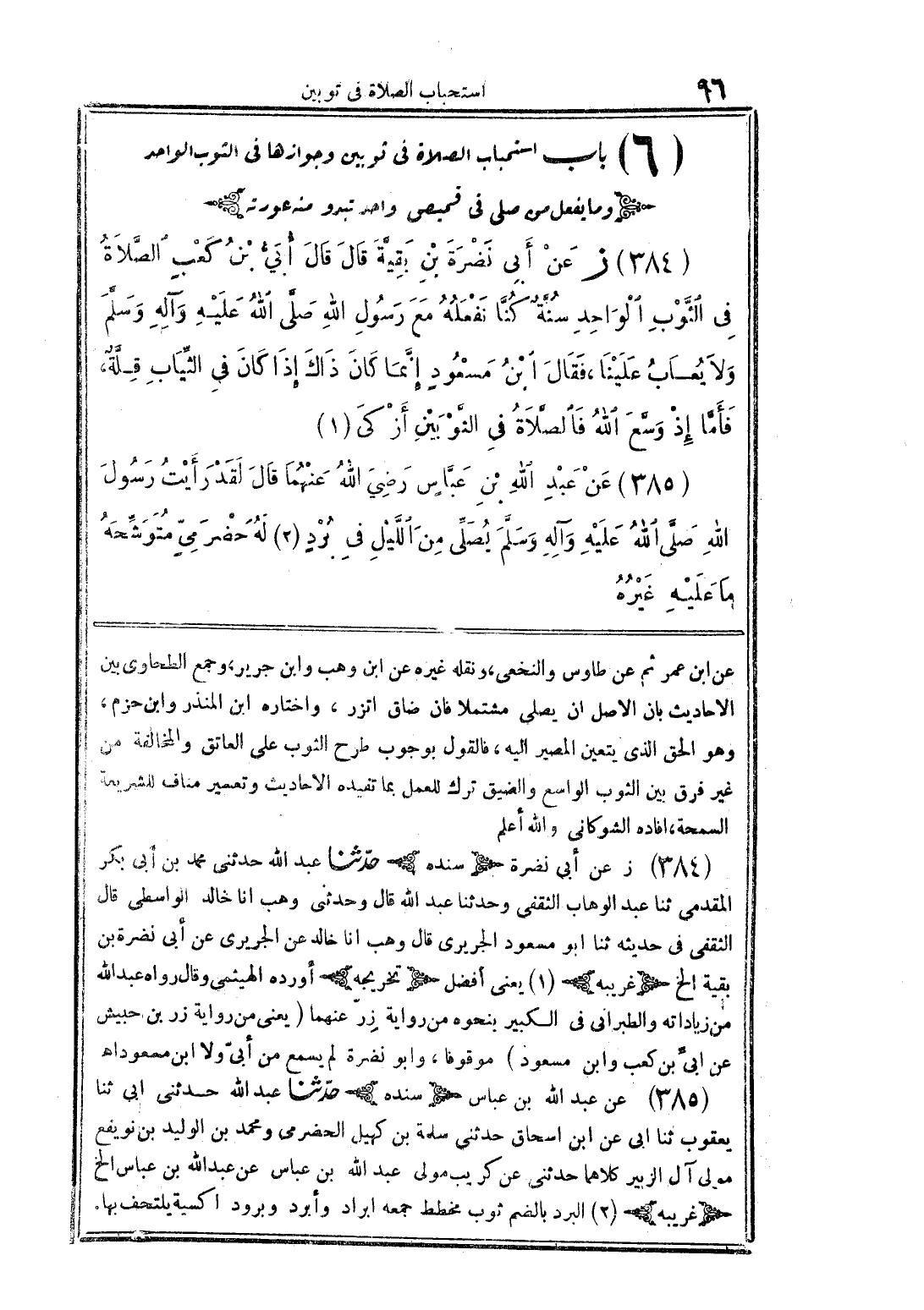 (384) ز عن أبى نضرة بن بقيَّة قال قال أبيُّ بن كعبٍ الصَّلاة فى الثَّوب الواحد سنَّةٌ كنَّا نفعله مع رسول الله صلَّى الله عليه وآله وسلَّم ولا يعاب علينا، فقال ابن مسعودٍ إنَّما كان ذاك إذا كان فى الثِّياب قلَّةٌ، فأمَّا إذ وسَّع الله فالصَّلاة فى الثَّوبين أزكى (1)