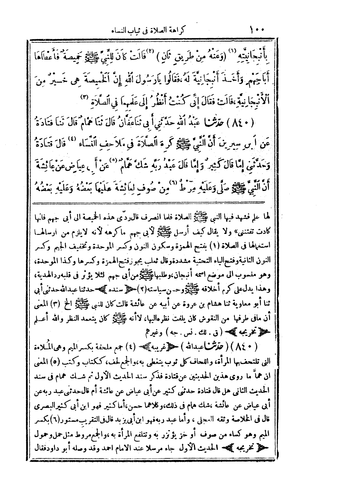 بأنبجانيته (1). وعنه من طريق ثان (2) قالت: كان للنبي صلى الله عليه وسلم خميصة فأعطاها أبا جهم وأخذ أنبجانية له، فقالوا: يا رسول الله: إن الخميصة هي خير من الأنبجانية، قالت: فقال: إني كنت أنظر إلى علمهما في الصلاة (3). 840 - حدثنا عبد الله حدثني أبي ثنا عفان قال ثنا همام قال ثنا قتادة عن ابن سيرين أن النبي صلى الله عليه وسلم كره الصلاة في ملاحف النساء (4). قال قتادة: وحدثني، إما قال: كثير، وإما قال: عبد ربه، شك همام (5)، عن أبي عياض عن عائشة أن النبي صلى الله عليه وسلم صلى وعليه مرط (6) من صوف لعائشة عليها بعضه وعليه بعضه
