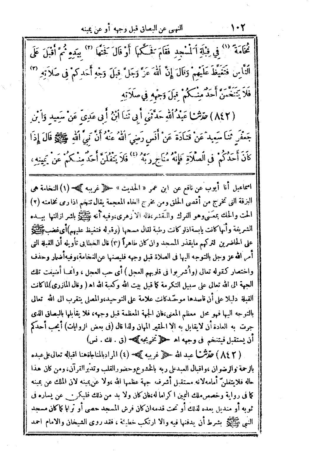 إسماعيل أنا أيوب عن نافع عن ابن عمر (الحديث). (غريبه) 1 - النخامة هي البزقة التي تخرج من أقصى الحلق ومن مخرج الخاء المعجمة يقال تنخم إذا رمى نخامته. 2 - الحت والحك بمعنى، وهو الفرك والقشر، قاله الأزهري، وفيه أنه صلى الله عليه وسلم باشر إزالتها بيده الشريفة وأنها كانت يابسة إذ لو كانت رطبة لقال مسحها. وقوله «فتغيظ عليهم» أي غضب صلى الله عليه وسلم على الحاضرين لتركهم ما يقذر المسجد وإن كان طاهرًا. 3 - قال الخطابي: تأويله أن القبلة التي أمر الله عز وجل بالتوجه إليها في الصلاة قبل وجهه فليصنها عن النخامة، وفيه إضمار وحذف واختصار، كقوله تعالى {وَأُشْرِبُوا فِي قُلُوبِهِمُ الْعِجْلَ} [البقرة/93] أي حب العجل، وإنما أضيفت تلك الجهة إلى الله تعالى على سبيل التكرمة كما قيل بيت الله وكعبة الله. اهـ. وقال المازري: لما كانت القبلة دليلاً على أن قاصدها موحد كانت علامة على التوحيد، والمصلي يتقرب إلى الله تعالى بالتوجه إليها فهو محل معظم المعنى، فإن الجهة المعظمة قبل وجهه، فلا يقابلها بالبصاق الذي جرت به العادة أن لا يقابل به إلا الحقير المهان ولذا قال (في بعض الروايات) «أيحب أحدكم أن يستقبل فيتنخم في وجهه». اهـ. (تخريجه) (ق. لك. نس).