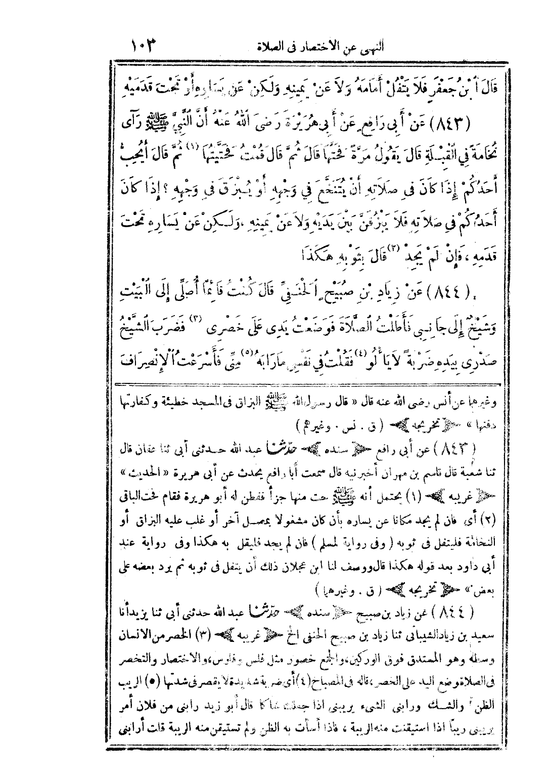 قال ابن جعفر: فلا يتفل أمامه ولا عن يمينه ولكن عن يساره أو تحت قدميه. 843 - عن أبي رافع عن أبي هريرة رضي الله عنه أن النبي صلى الله عليه وسلم رأى نخامة في القبلة قال: يقول مرة فحتها قال: ثم قال: قمت فحتيتها (1) ثم قال: أيحب أحدكم إذا كان في صلاته أن يتنخع في وجهه أو يبزق في وجهه؟ إذا كان أحدكم في صلاته فلا يبزقن بين يديه ولا عن يمينه، ولكن عن يساره تحت قدمه، فإن لم يجد (2) قال بثوبه هكذا. 844 - عن زياد بن صبيح الحنفي قال: كنت قائمًا أصلي إلى البيت وشيخ إلى جانبي فأطلت الصلاة فوضعت يدي على خصري (3) فضرب الشيخ صدري بيده ضربة لا يألو (4) فقلت في نفسي: ما رابه (5) مني؟ فأسرعت الانصراف