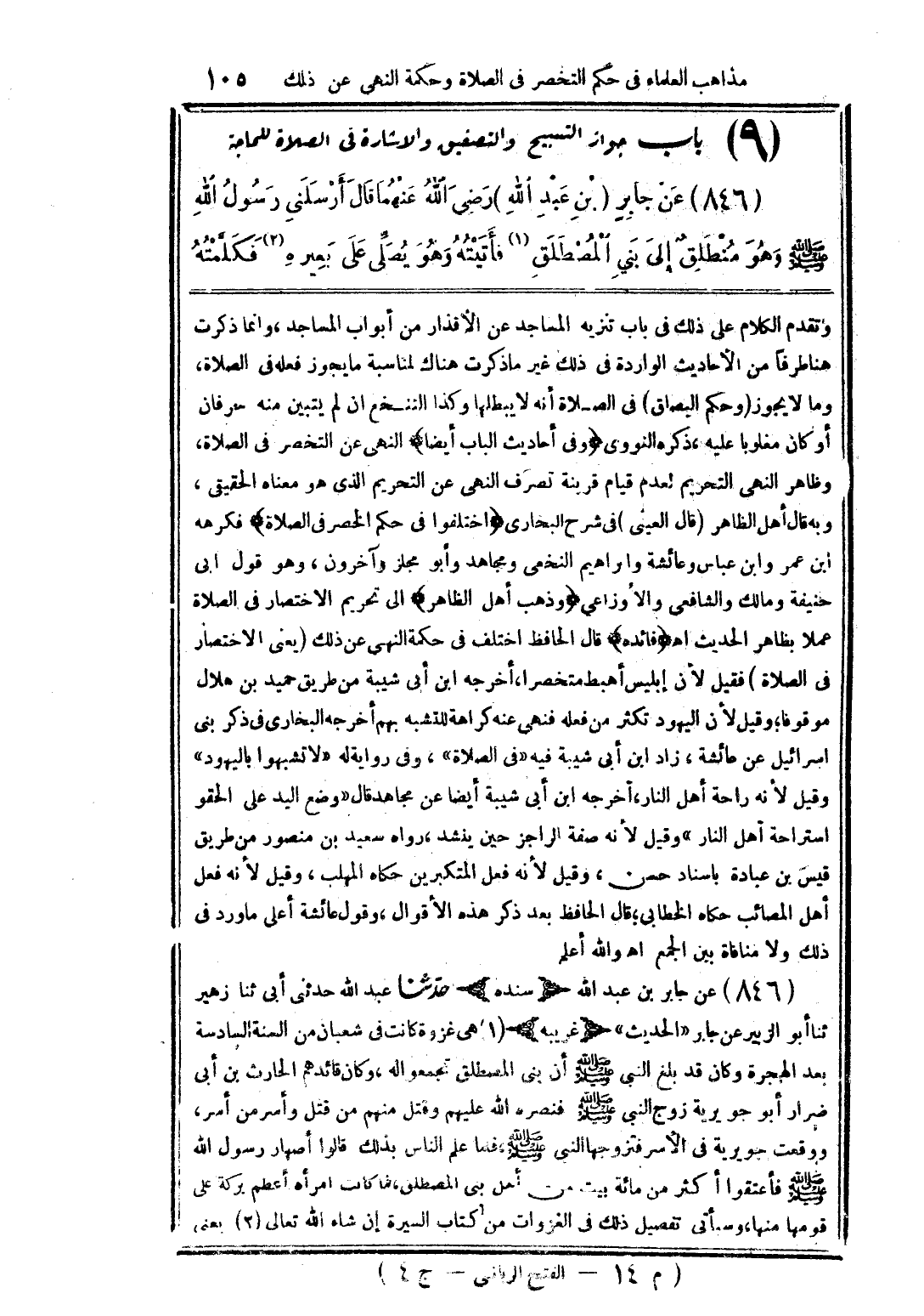 وتقدم الكلام على ذلك في باب تنزيه المساجد عن الأقذار من أبواب المساجد، وإنما ذكرت هنا طرفًا من الأحاديث الواردة في ذلك غير ما ذكرت هناك لمناسبة ما يجوز فعله في الصلاة، وما لا يجوز. وحكم البصاق في الصلاة أنه لا يبطلها، وكذا التنخع إن لم يتبين منه حرفان أو كان مغلوبًا عليه. ذكره النووي. وفي أحاديث الباب أيضًا النهي عن التخصر في الصلاة، وظاهر النهي التحريم لعدم قيام قرينة تصرف النهي عن التحريم الذي هو معناه الحقيقي، وبه قال أهل الظاهر. قال العيني في (شرح البخاري): اختلفوا في حكم الخصر في الصلاة، فكرهه ابن عمر وابن عباس وعائشة وإبراهيم النخعي ومجاهد وأبو مجلز وآخرون، وهو قول أبي حنيفة ومالك والشافعي والأوزاعي. وذهب أهل الظاهر إلى تحريم الاختصار في الصلاة عملاً بظاهر الحديث. اهـ. فائدة: قال الحافظ اختلف في حكمة النهي عن ذلك (يعني الاختصار في الصلاة) فقيل: لأن إبليس أهبط متخصرًا، أخرجه ابن أبي شيبة من طريق حميد بن هلال موقوفًا، وقيل: لأن اليهود تكثير من فعله فنهي عنه كراهة للتشبه بهم. أخرجه البخاري في ذكر بني إسرائيل عن عائشة، زاد ابن أبي شيبة فيه «في الصلاة»، وفي رواية له «لا تشبهوا باليهود». وقيل: لأنه راحة أهل النار، أخرجه ابن أبي شيبة أيضًا عن مجاهد قال: «وضع اليد على الحقو استراحة أهل النار». وقيل: لأنه صفة الراجز حين ينشد، رواه سعيد بن منصور من طريق قيس بن عبادة بإسناد حسن. وقيل: لأنه فعل المتكبرين. حكاه المهلب. وقيل: لأنه فعل أهل المصائب. حكاه الخطابي. قال الحافظ بعد ذكر هذه الأقوال: وقول عائشة أعلى ما ورد في ذلك، ولا منافاة بين الجميع. اهـ. والله أعلم. 846 - عن جابر بن عبد الله (سنده) حدثنا عبد الله حدثني أبي ثنا زهير ثنا أبو الزبير عن جابر (الحديث). (غريبه) 1 - هي غزوة كانت في شعبان من السنة السادسة بعد الهجرة، وكان قد بلغ النبي صلى الله عليه وسلم أن بني المصطلق تجمعوا له، وكان قائدهم الحارث بن أبي ضرار أبو جويرية زوج النبي صلى الله عليه وسلم فنصره الله عليهم وقتل منهم من قتل وأسر من أسر، ووقعت جويرية في الأسر فتزوجها النبي صلى الله عليه وسلم، فلما علم الناس بذلك قالوا: أصهار رسول الله صلى الله عليه وسلم. فأعتقوا أكثر من مائة بيت من أهل بني المصطلق، فما كانت امرأة أعظم بكرة على قومها منها. وسيأتي تفصيل ذلك في الغزوات من كتاب السيرة إن شاء الله تعالى. 2 - يعني
