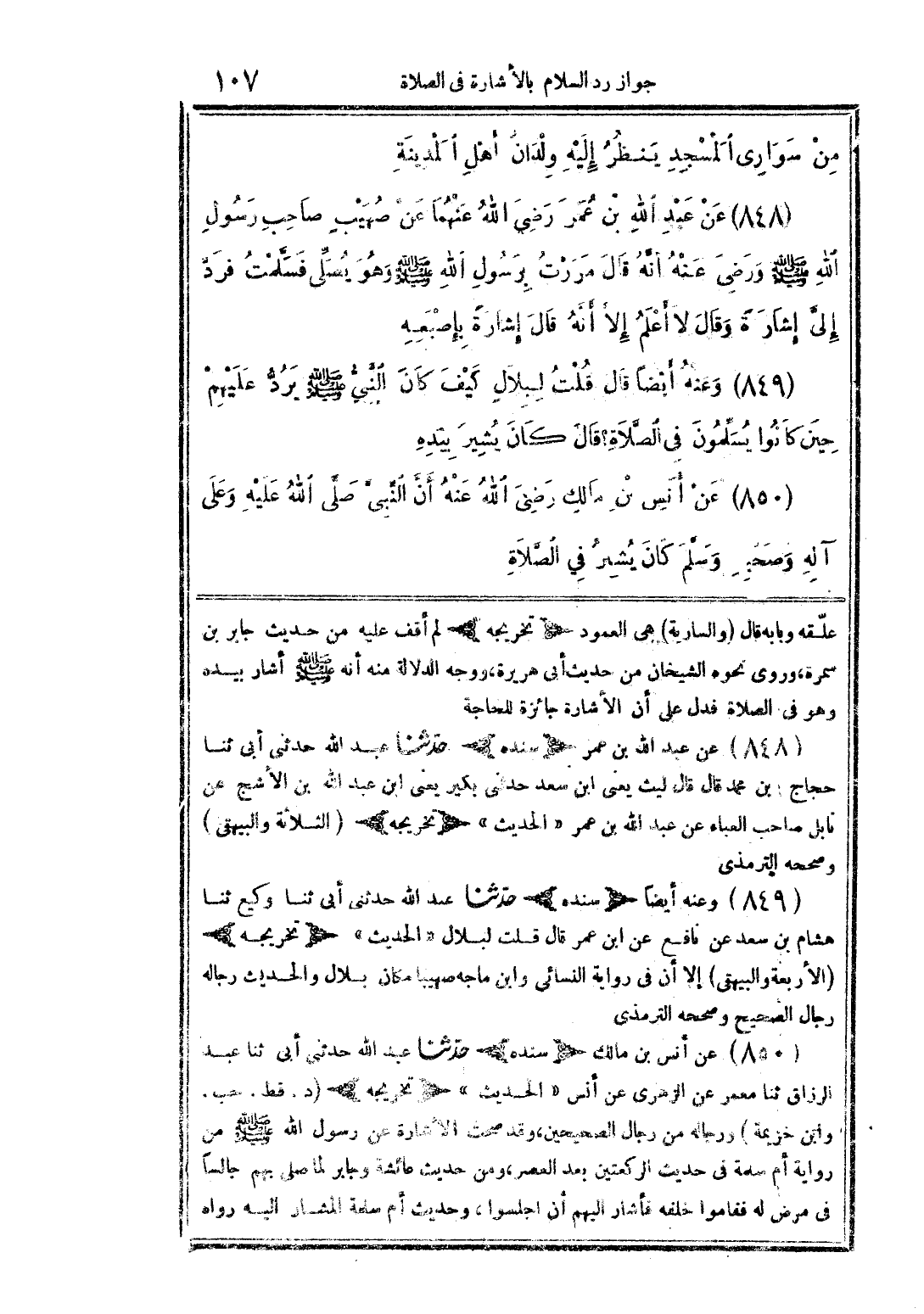 من سواري المسجد ينظر إليه ولدان أهل المدينة. 848 عن عبد الله بن عمر رضي الله عنهما عن صهيب صاحب رسول الله صلى الله عليه وسلم ورضي عنه أنه قال: مررت برسول الله صلى الله عليه وسلم وهو يصلي، فسلمت، فرد إلي إشارة، وقال: لا أعلم إلا أنه قال إشارة بإصبعه. 849 - وعنه أيضًا قال: قلت لبلال: كيف كان النبي صلى الله عليه وسلم يرد عليهم حين كانوا يسلمون في الصلاة؟ قال: كان يشير بيده. 850 - عن أنس بن مالك رضي الله عنه أن النبي صلى الله عليه وعلى آله وصحبه وسلم كان يشير في الصلاة.