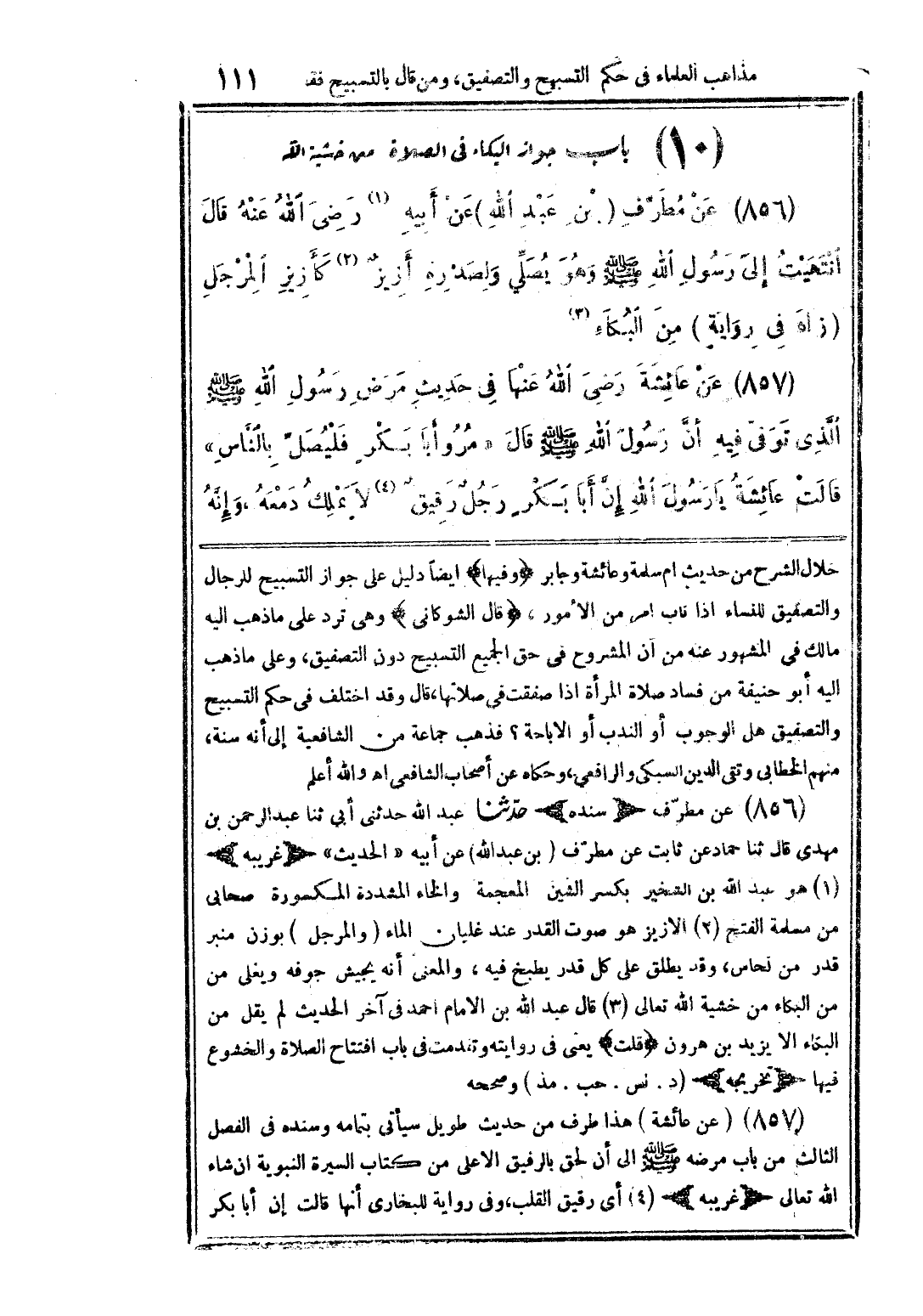 خلال الشرح من حديث أم سلمة وعائشة وجابر. وفيها أيضًا دليل على جواز التسبيح للرجال والتصفيق للنساء إذا ناب أمر من الأمور. قال الشوكاني: وهي ترد على ما ذهب إليه مالك في المشهور عنه من أن المشروع في حق الجميع التسبيح دون التصفيق، وعلى ما ذهب إليه أبو حنيفة من فساد صلاة المرأة إذا صفقت في صلاتها، قال: وقد اختلف في حكم التسبيح والتصفيق: هل الوجوب أو الندب أو الإباحة؟ فذهب جماعة من الشافعية إلى أنه سنة، منهم الخطابي وتقي الدين السبكي والرافعي، وحكاه عن أصحاب الشافعي. اهـ. والله أعلم. 856 - عن مطرف (سنده) حدثنا عبد الله حدثني أبي ثنا عبد الرحمن بن مهدي قال ثنا حماد عن ثابت عن مطرف (بن عبد الله) عن أبيه (الحديث). (غريبه) 1 - هو عبد الله بن الشخير بكسر الشين المعجمة والخاء المشددة المكسورة صحابي من مسلمة الفتح.