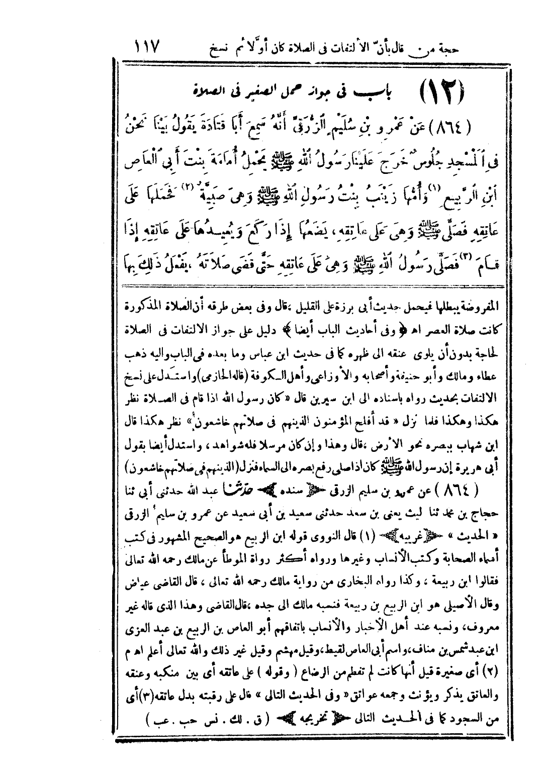 المفروضة يبطلها فيحمل حديث أبي برزة على القليل، قال: وفي بعض طرقه أن الصلاة المذكورة كانت صلاة العصر. اهـ. وفي أحاديث الباب أيضًا دليل على جواز الالتفات في الصلاة لحاجة بدون أن يلوي عنقه إلى ظهره كما في حديث ابن عباس وما بعده في الباب وإليه ذهب عطاء ومالك وأبو حنيفة وأصحابه والأوزاعي وأهل الكوفة. قاله الحازمي، واستدل على نسخ الالتفات بحديث رواه بإسناده إلى ابن سيرين قال: «كان رسول الله إذا قام في الصلاة نظر هكذا وهكذا فلما نزل {قَدْ أَفْلَحَ الْمُؤْمِنُونَ (1) الَّذِينَ هُمْ فِي صَلَاتِهِمْ خَاشِعُونَ (2)} [المؤمنون/1، 2] نظر هكذا. قال ابن شهاب ببصره نحو الأرض، قال: وهذا وإن كان مرسلاً فله شواهد، واستدل أيضًا بقول أبي هريرة إن رسول الله صلى الله عليه وسلم كان إذا صلى رفع بصره إلى السماء فنزل {الَّذِينَ هُمْ فِي صَلَاتِهِمْ خَاشِعُونَ} [المؤمنون/2]. 864 - عن عمرو بن سليم الزرقي (سنده) حدثنا عبد الله حدثني أبي ثنا حجاج بن محمد ثنا ليث يعني بن سعد حدثني سعيد بن أبي سعيد عن عمرو بن سليم الزرقي (الحديث). (غريبه) 1 - قال النووي: قوله «ابن الربيع» هو الصحيح المشهور في كتب أسماء الصحابة وكتب الأنساب وغيرها، ورواه أكثر رواة (الموطأ) عن مالك رحمه الله تعالى، فقالوا: ابن ربيعة، وكذا رواه البخاري من رواية مالك رحمه الله تعالى، قال القاضي عياض: وقال الأصيلي هو ابن الربيع بن ربيعة فنسبه مالك إلى جده، قال القاضي: وهذا الذي قاله غير معروف، ونسبه عند أهل الأخبار والأنساب باتفاقهم أبو العاص بن الربيع بن عبد العزى بن عبد شمس بن عبد مناف، واسم أبي العاص لقيط، وقيل مهشم، وقيل غير ذلك، والله تعالى أعلم. اهـ. م. 2 - أي صغيرة قيل أنها كانت لم تفطم من الرضاع. وقوله «على عاتقه» أي بين منكبه وعنقه، والعاتق يذكر ويؤنث وجمعه عواتق. وفي الحديث التالي قال: «على رقبته» بدل «عاتقه». 3 - أي من السجود كما في الحديث التالي. (تخريجه) (ق. لك. نس. حب. عب).
