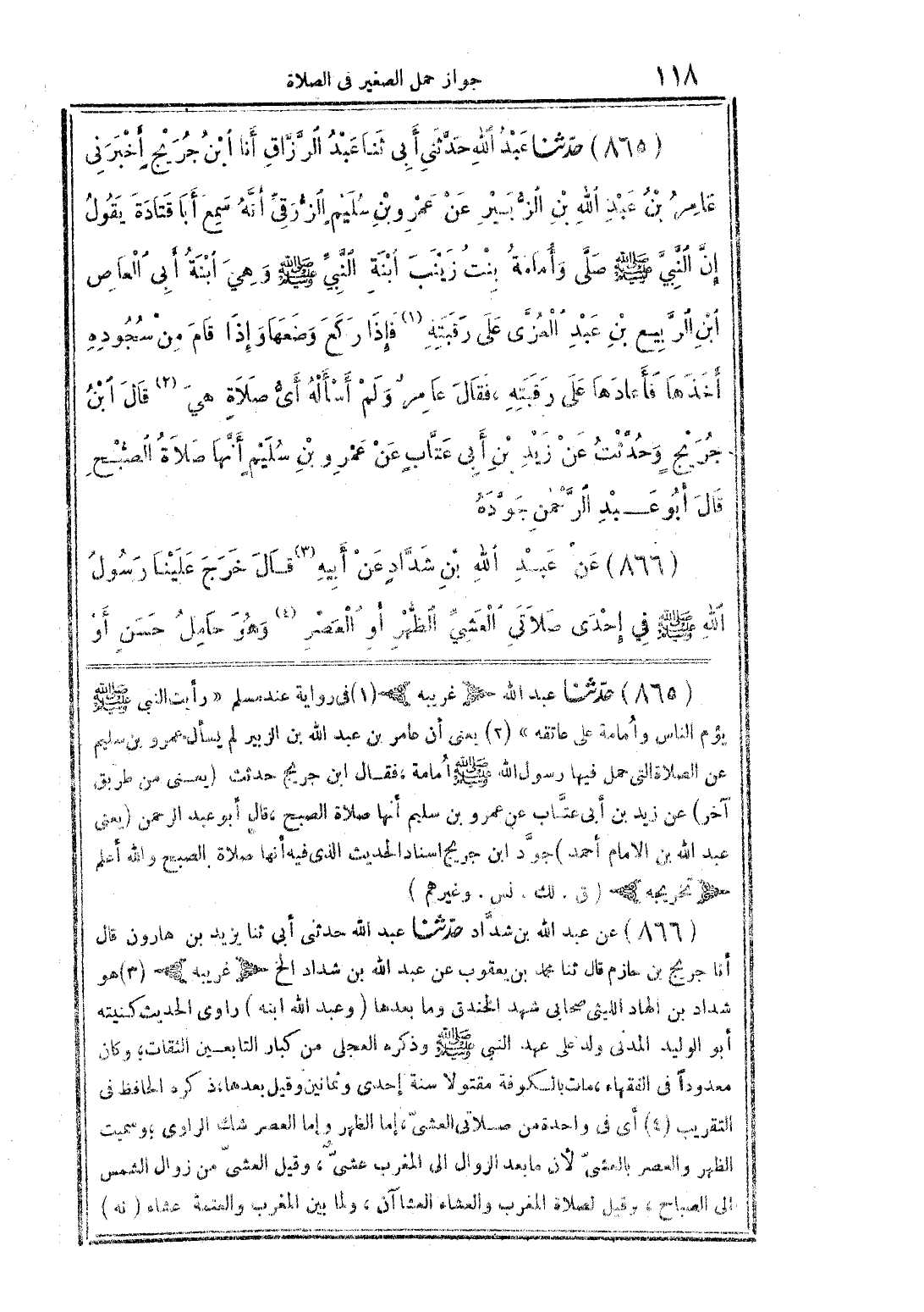 865 - حدثنا عبد الله حدثني أبي ثنا عبد الرزاق أنا ابن جريج أخبرني عامر بن عبد الله بن الزبير عن عمرو بن سليم الزرقي أنه سمع أبا قتادة يقول إن النبي صلى الله عليه وسلم صلى وأمامة بنت زينب ابنة النبي صلى الله عليه وسلم وهي ابنة أبي العاص بن الربيع بن عبد العزى على رقبته (1)، فإذا ركع وضعها، وإذا قام من سجوده أخذها فأعادها على رقبته، فقال عامر: ولم أسأله أي صلاة هي (2). قال ابن جريج وحدثت عن زيد بن أبي عتاب عن عمرو بن سليم أنها صلاة الصبح. قال أبو عبد الرحمن: جوده. 866 - عن عبد الله بن شداد عن أبيه (3) قال: خرج علينا رسول الله صلى الله عليه وسلم في إحدى صلاتي العشي الظهر أو العصر (4) وهو حامل حسن أو