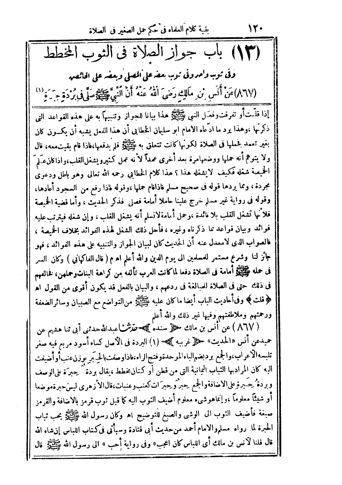 13 - باب جواز الصلاة في الثوب المخطط وفي ثوب واحد وفي ثوب بعضه على المصلي وبعضه على الحائض 867 - عن أنس بن مالك رضي الله عنه أن النبي صلى الله عليه وسلم صلى في بردة حبرة (1)