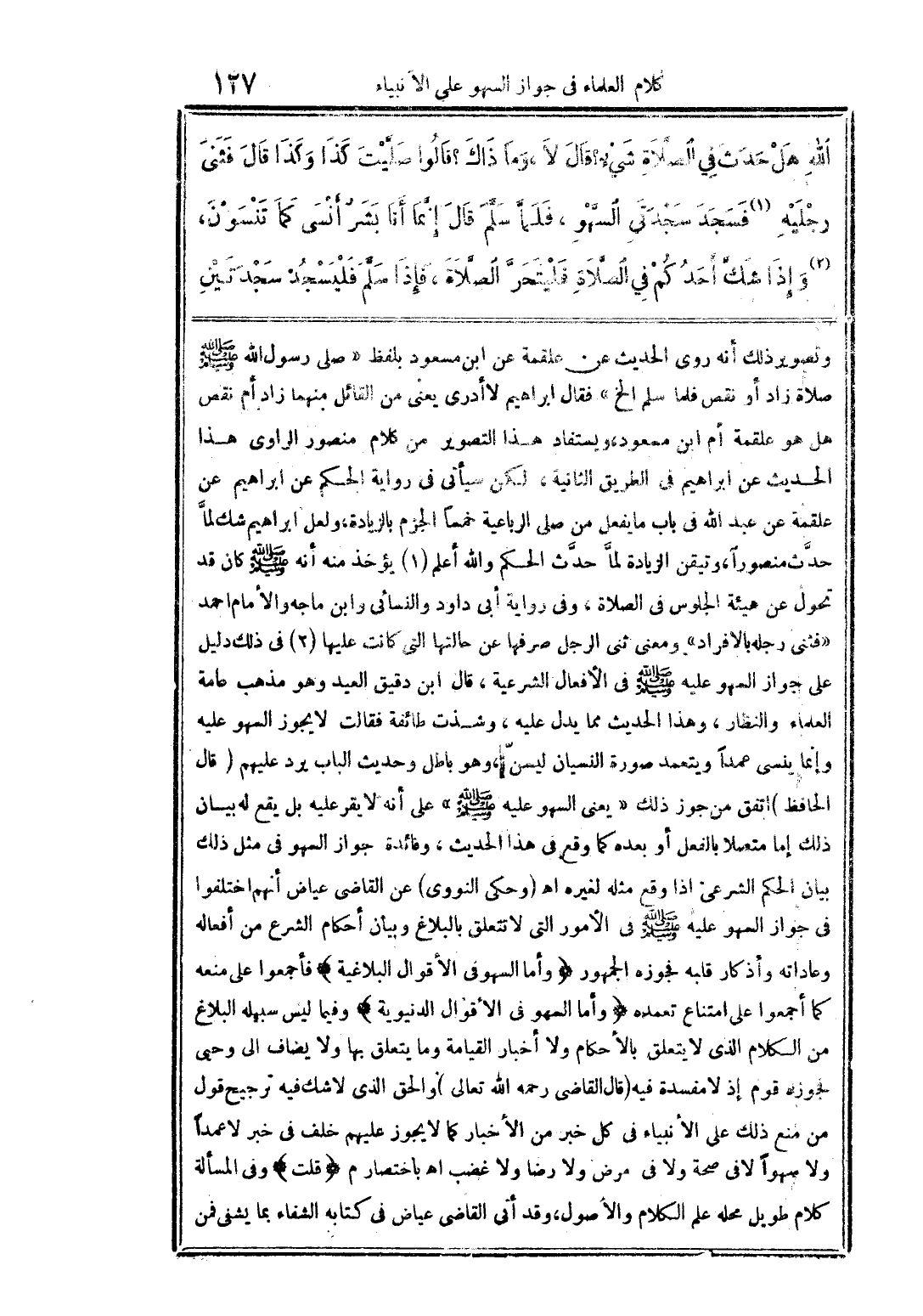 وتصوير ذلك أنه روى الحديث عن علقمة عن ابن مسعود بلفظ «صلى رسول الله صلى الله عليه وسلم صلاة زاد أو نقص فلما سلم» الخ. فقال إبراهيم «لا أدري» يعني مَن القائل منهما «زاد أم نقص» هل هو علقمة أم ابن مسعود؟ ويستفاد هذا التصوير من كلام منصور الراوي هذا الحديث عن إبراهيم في الطريق الثانية، لكن سيأتي في رواية الحكم عن إبراهيم عن علقمة عن عبد الله في باب ما يفعل من صلى الرباعية خمسًا الجزم بالزيادة، ولعل إبراهيم شك لما حدث منصورًا، وتيقن الزيادة لما حدث الحكم والله أعلم. 1 - يؤخذ منه أنه صلى الله عليه وسلم كان قد تحول عن هيئة الجلوس في الصلاة، وفي رواية أبي داود والنسائي وابن ماجه والإمام أحمد «فثني رجله بالإفراد» ومعنى ثنى الرجل صرفها عن حالتها التي كانت عليها. 2 - في ذلك دليل على جواز السهو عليه صلى الله عليه وسلم في الأفعال الشرعية، قال ابن دقيق العيد: وهو مذهب عامة العلماء والنظار، وهذا الحديث مما يدل عليه، وشذت طائفة فقالت: لا يجوز السهو عليه وإنما ينسى عمدًا ويتعمد صورة النسيان ليسن، وهو باطل وحديث الباب يرد عليهم. قال الحافظ: اتفق من جوز ذلك (يعني السهو عليه صلى الله عليه وسلم) على أنه لا يقر عليه بل يقع له بيان ذلك إما متصلاً بالفعل أو بعده كما وقع في هذا الحديث، وفائدة جواز السهو في مثل ذلك بيان الحكم الشرعي إذا وقع مثله لغيره. اهـ. وحكى النووي عن القاضي عياض أنهم اختلفوا في جواز السهو عليه صلى الله عليه وسلم في الأمور التي لا تتعلق بالبلاغ وبيان أحكام الشرع من أفعاله وعاداته وأذكار قلبه فجوزه الجمهور. وأما السهو في الأقوال البلاغية، فأجمعوا على منعه كما أجمعوا على امتناع تعمده. وأما السهو في الأقوال الدنيوية وفيما ليس سبيله البلاغ من الكلام الذي لا يتعلق بالأحكام ولا أخبار القيامة وما يتعلق بها ولا يضاف إلى وحي، فجوزه قوم إذ لا مفسدة فيه. قال القاضي رحمه الله تعالى: والحق الذي لا شك فيه ترجيح قول من منع ذلك على الأنبياء في كل خبر من الأخبار، كما لا يجوز عليهم خلف في خبر لا عمدًا ولا سهوًا، لا في صحة ولا في مرض، ولا رضا ولا غضب. اهـ. باختصار م. قلت: وفي المسألة كلام طويل محله علم الكلام والأصول، وقد أتى القاضي عياض في كتابه (الشفاء) بما يشفي فمن