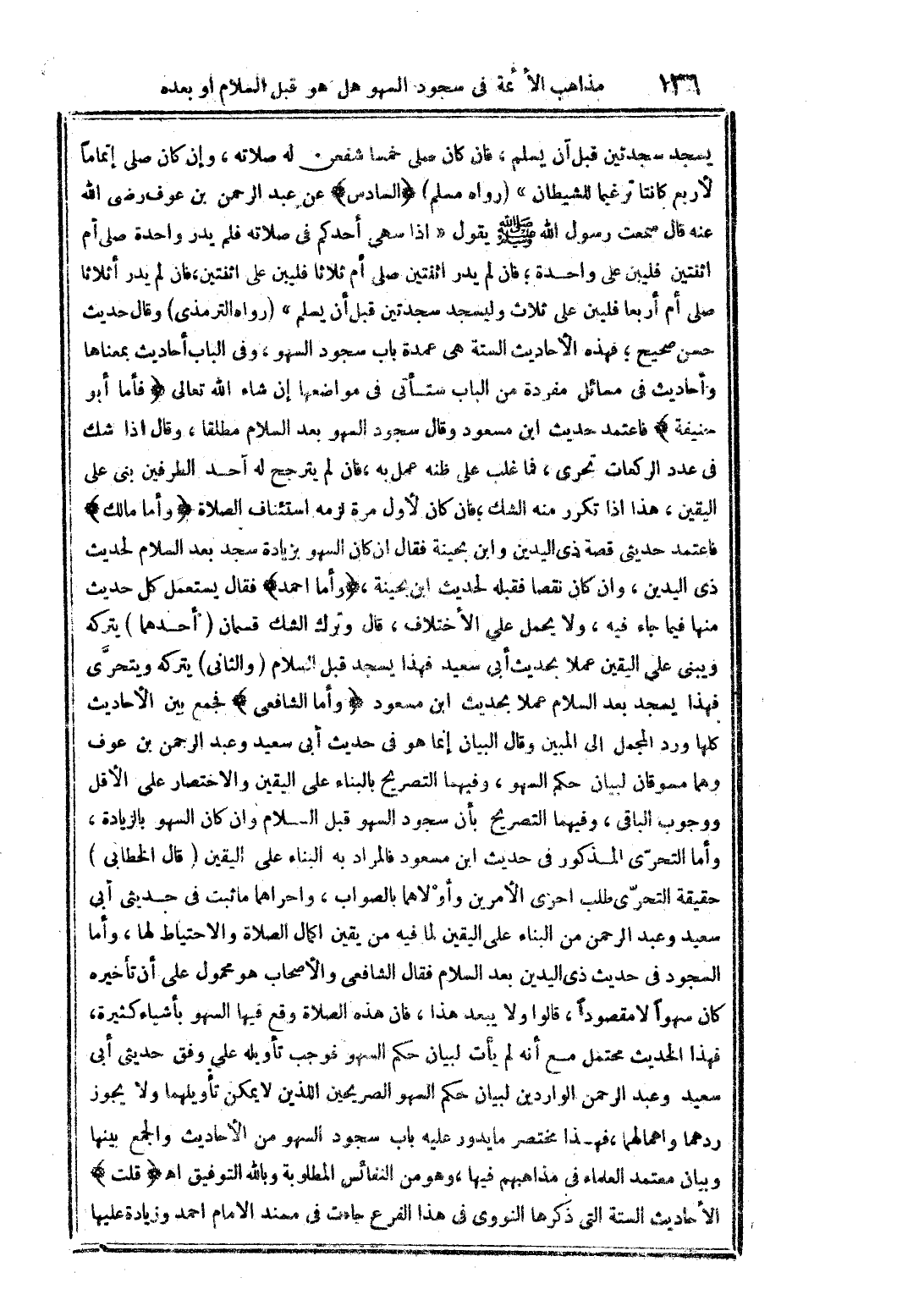 يسجد سجدتين قبل أن يسلم، فإن كان صلى خمسًا شفعن له صلاته، وإن كان صلى إتمامًا لأربع كانتا ترغيمًا للشيطان» رواه مسلم. السادس: عن عبد الرحمن بن عوف رضي الله عنه قال: سمعت رسول الله صلى الله عليه وسلم يقول: «إذا سهى أحدكم في صلاته فلم يدر واحدة صلى أم اثنتين فليبن على واحدة، فإن لم يدر اثنتين صلى أم ثلاثًا فليبن على اثنتين، فإن لم يدر أثلاثًا صلى أم أربعًا فليبن على ثلاث وليسجد سجدتين قبل أن يسلم» رواه الترمذي وقال: حديث حسن صحيح، فهذه الأحاديث الستة هي عمدة باب سجود السهو، وفي الباب أحاديث بمعناها وأحاديث في مسائل مفردة من الباب ستأتي في مواضعها إن شاء الله تعالى. فأما أبو حنيفة فاعتمد حديث ابن مسعود وقال: سجود السهو بعد السلام مطلقًا، وقال: إذا شك في عدد الركعات تحرى، فما غلب على ظنه عمل به، فإن لم يترجح له أحد الطرفين بنى على اليقين، هذا إذا تكرر منه الشك، فإن كان لأول مرة لزمه استئناف الصلاة. وأما مالك فاعتمد حديثي قصة ذي اليدين وابن بحينة فقال: إن كان السهو بزيادة سجد بعد السلام لحديث ذي اليدين، وإن كان نقصًا فقبله لحديث ابن بحينة. وأما أحمد فقال: يستعمل كل حديث منها فيما جاء فيه، ولا يحمل على الاختلاف، قال: وترك الشك قسمان: أحدهما يتركه ويبني على اليقين عملاً بحديث أبي سعيد فهذا يسجد قبل السلام، والثاني يتركه ويتحرى فهذا يسجد بعد السلام عملاً بحديث ابن مسعود. وأما الشافعي فجمع بين الأحاديث كلها ورد المجمل إلى المبين وقال: البيان إنما هو في حديث أبي سعيد وعبد الرحمن بن عوف وهما مسوقان لبيان حكم السهو، وفيهما التصريح بالبناء على اليقين والاختصار على الأقل ووجوب الباقي، وفيهما التصريح بأن سجود السهو قبل السلام وإن كان السهو بالزيادة، وأما التحري المذكور في حديث ابن مسعود فالمراد به البناء على اليقين. قال الخطابي: حقيقة التحري طلب أحرى الأمرين وأولاهما بالصواب، وأحراهما ما ثبت في حديثي أبي سعيد وعبد الرحمن من البناء على اليقين لما في من يقين إكمال الصلاة والاحتياط لها، وأما السجود في حديث ذي اليدين بعد السلام فقال الشافعي والأصحاب: هو محمول على أن تأخيره كان سهوًا لا مقصودًا، قالوا: ولا يبعد هذا، فإن هذه الصلاة وقع فيها السهو بأشياء كثيرة، فهذا الحديث محتمل مع أنه لم يأت لبيان حكم السهو فوجب تأويله على وفق حديثي أبي سعيد وعبد الرحمن الواردين لبيان حكم السهو الصريحين اللذين لا يمكن تأويلهما ولا يجوز ردهما وإهمالهما، فهذا مختصر ما يدور عليه باب سجود السهو من الأحاديث والجمع بينها وبيان معتمد العلماء في مذاهبهم فيها، وهو من النفائس المطلوبة وبالله التوفيق. اهـ. قلت: الأحاديث الستة التي ذكرها النووي في هذا الفرع جاءت في مسند الإمام أحمد وزيادة عليها