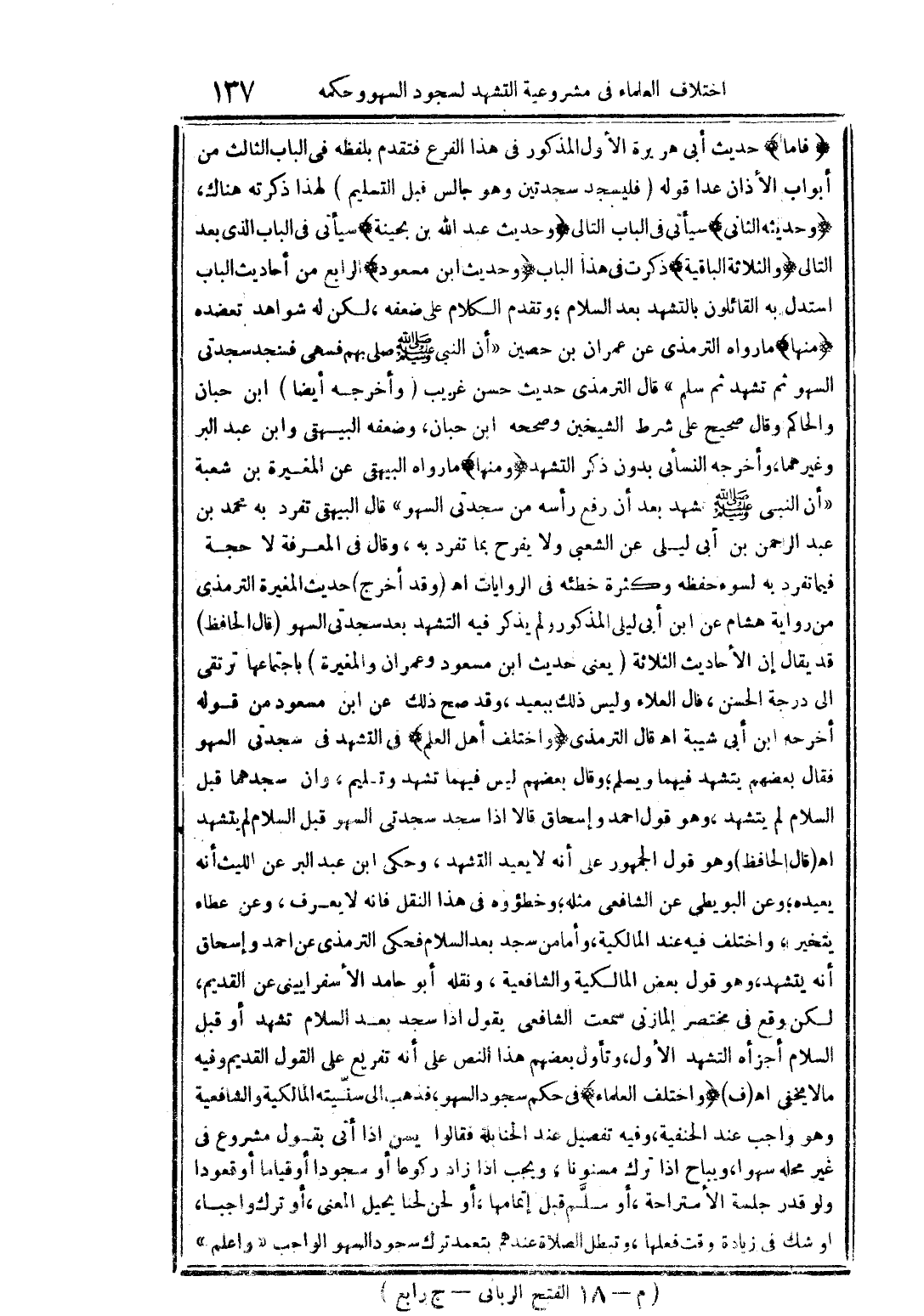 فأما حديث أبي هريرة الأول المذكور في هذا الفرع فتقدم بلفظه في الباب الثالث من أبواب الأذان عدا قوله «فليسجد سجدتين وهو جالس قبل التسليم» فهذا ذكرته هناك، وحديثه الثاني سيأتي في الباب التالي، وحديث عبد الله بن بحينة سيأتي في الباب الذي بعد التالي، والثلاثة الباقية ذكرت في هذا الباب، وحديث ابن مسعود الرابع من أحاديث الباب استدل به القائلون بالتشهد بعد السلام، وتقدم الكلام على ضعفه، لكن له شواهد تعضده منها ما رواه الترمذي عن عمران بن حصين «أن النبي صلى الله عليه وسلم صلى بهم فسهى فسجد سجدتي السهو ثم تشهد ثم سلم» قال الترمذي: حديث حسن غريب. وأخرجه أيضًا ابن حبان والحاكم وقال: صحيح على شرط الشيخين، وصححه ابن حبان، وضعفه البيهقي وابن عبد البر وغيرهما، وأخرجه النسائي بدون ذكر التشهد. ومنها ما رواه البيهقي عن المغيرة بن شعبة «أن النبي صلى الله عليه وسلم تشهد بعد أن رفع رأسه من سجدتي السهو» قال البيهقي: تفرد به محمد بن عبد الرحمن بن أبي ليلى عن الشعبي ولا يفرح بما تفرد به، وقال في (المعرفة): لا حجة فيما تفرد به لسوء حفظه وكثرة خطئه في الروايات. اهـ. وقد أخرج حديث المغيرة الترمذي من رواية هشام عن ابن أبي ليلى المذكور، ولم يذكر فيه التشهد بعد سجدتي السهو. قال الحافظ: قد يقال إن الأحاديث الثلاثة (يعني حديث ابن مسعود وعمران والمغيرة) باجتماعها ترتقي إلى درجة الحسن، قال العلاء: وليس ذلك ببعيد، وقد صح ذلك عن ابن مسعود من قوله أخرجه ابن أبي شيبة. اهـ. قال الترمذي: واختلف أهل العلم في التشهد في سجدتي السهو، قال بعضهم: يتشهد فيهما ويسلم، وقال بعضهم: ليس فيهما تشهد وتسليم، وإن سجدهما قبل السلام لم يتشهد، وهو قول أحمد وإسحاق قالا: إذا سجد سجدتي السهو قبل السلام لم يتشهد. اهـ. قال الحافظ: وهو قول الجمهور على أنه لا يعيد التشهد، وحكى ابن عبد البر عن الليث أنه يعيده، وعن البويطي عن الشافعي مثله، وخطؤه في هذا النقل فإنه لا يعرف، وعن عطاء يتخير، واختلف فيه عند المالكية، وأما من سجد بعد السلام فحكى الترمذي عن أحمد وإسحاق أنه يتشهد، وهو قول بعض المالكية والشافعية، ونقله أبو حامد الإسفراييني عن القديم، لكن وقع في (مختصر المازني) سمعت الشافعي يقول: إذا سجد بعد السلام تشهد أو قبل السلام أجزأه التشهد الأول، وتأول بعضهم هذا النص على أنه تفريع على القول القديم وفيه ما لا يخفى. اهـ. (ف). واختلف العلماء في حكم سجود السهو، فذهب إلى سنيته المالكية والشافعية، وهو واجب عند الحنفية، وفيه تفصيل عند الحنابلة، فقالوا: يسن إذا أتى بقول مشروع في غير محله سهوًا، ويباح إذا ترك مسنونًا، ويجب إذا زاد ركوعًا أو سجودًا أو قيامًا أو قعودًا ولو قدر جلسة الاستراحة، أو سلم قبل إتمامها، أو لحن لحنًا يحيل المعنى، أو ترك واجبًا، أو شك في زيادة وقت فعلها، وتبطل الصلاة عندهم بتعمد ترك سجود السهو الواجب. واعلم