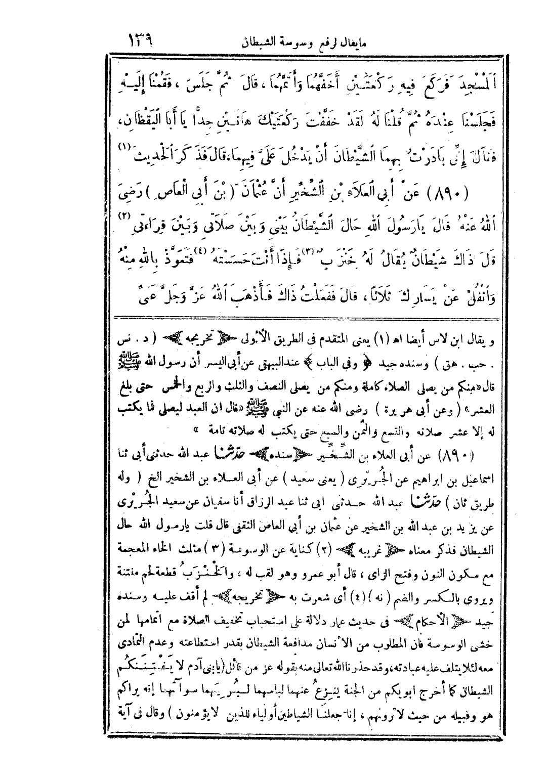 المسجد فركع فيه ركعتين أخفهما وأتمهما، قال: ثم جلس، فقمنا إليه، فجلسنا عنده ثم قلنا له: لقد خففت ركعتيك هاتين جدًا يا أبا اليقظان، فقال: إني بادرت بهما الشيطان أن يدخل علي فيهما. قال: فذكر الحديث (1). 890 - عن أبي العلاء بن الشخير أن عثمان (بن أبي العاص) رضي الله عنه قال: يا رسول الله حال الشيطان بيني وبين صلاتي وبين قراءتي (2). قال: ذاك شيطان يقال له خنزب (3)، فإذا أنت حسسته (4) فتعوذ بالله منه واتفل عن يسارك ثلاثًا، قال: ففعلت ذاك فأذهب الله عز وجل عني